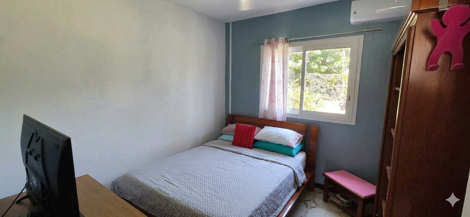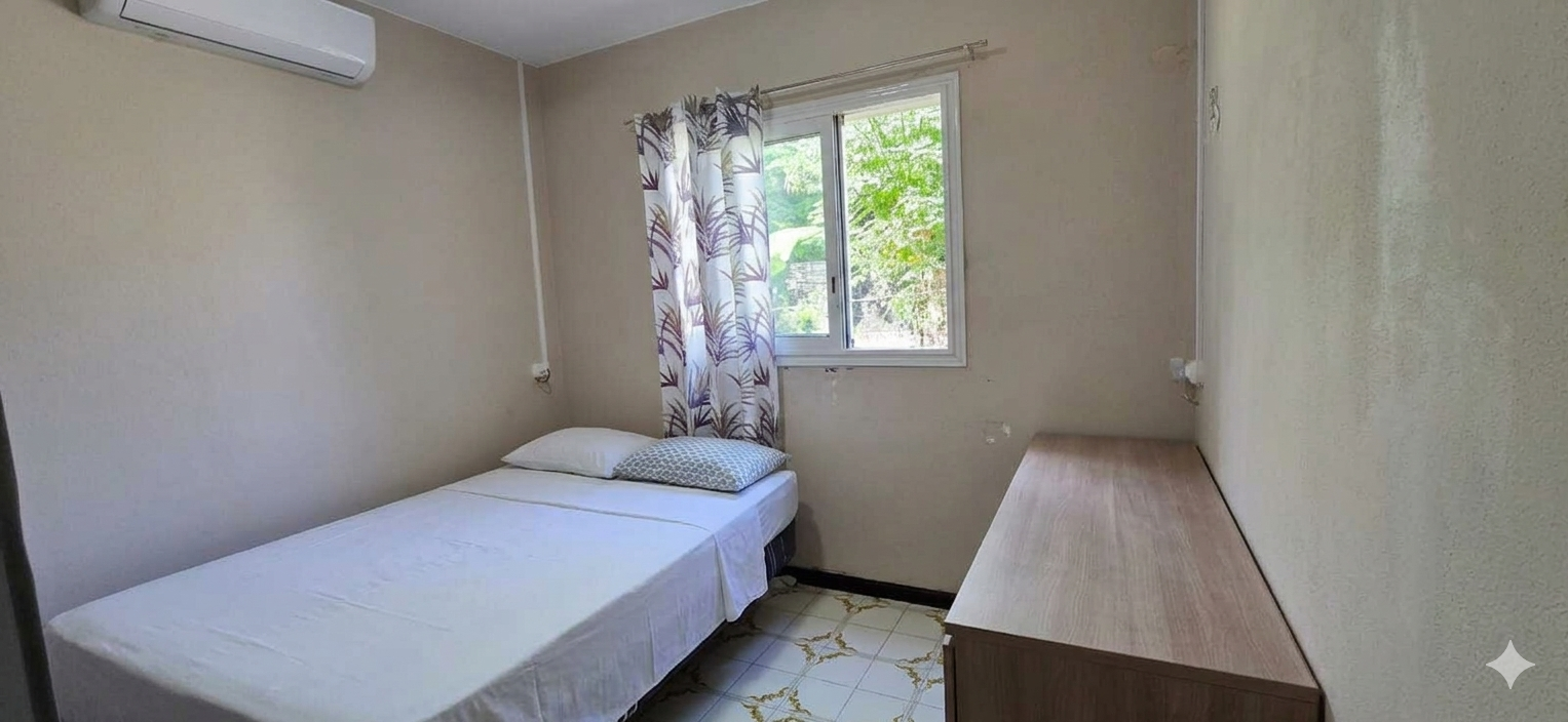 Elle se compose de 3 chambres climatisées, un séjour/salle à manger d'environ 30 m2 climatisé, une cuisine, une salle d'eau, un wc séparé, une petite varangue.