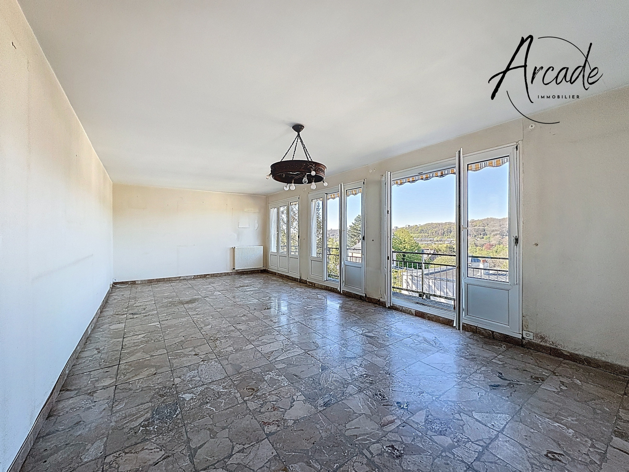 Vie de plain pied : entrée, séjour 34 m2 accès balcon exposé ouest, cuisine, trois chambres, salle de bains, wc. Travaux à prévoir