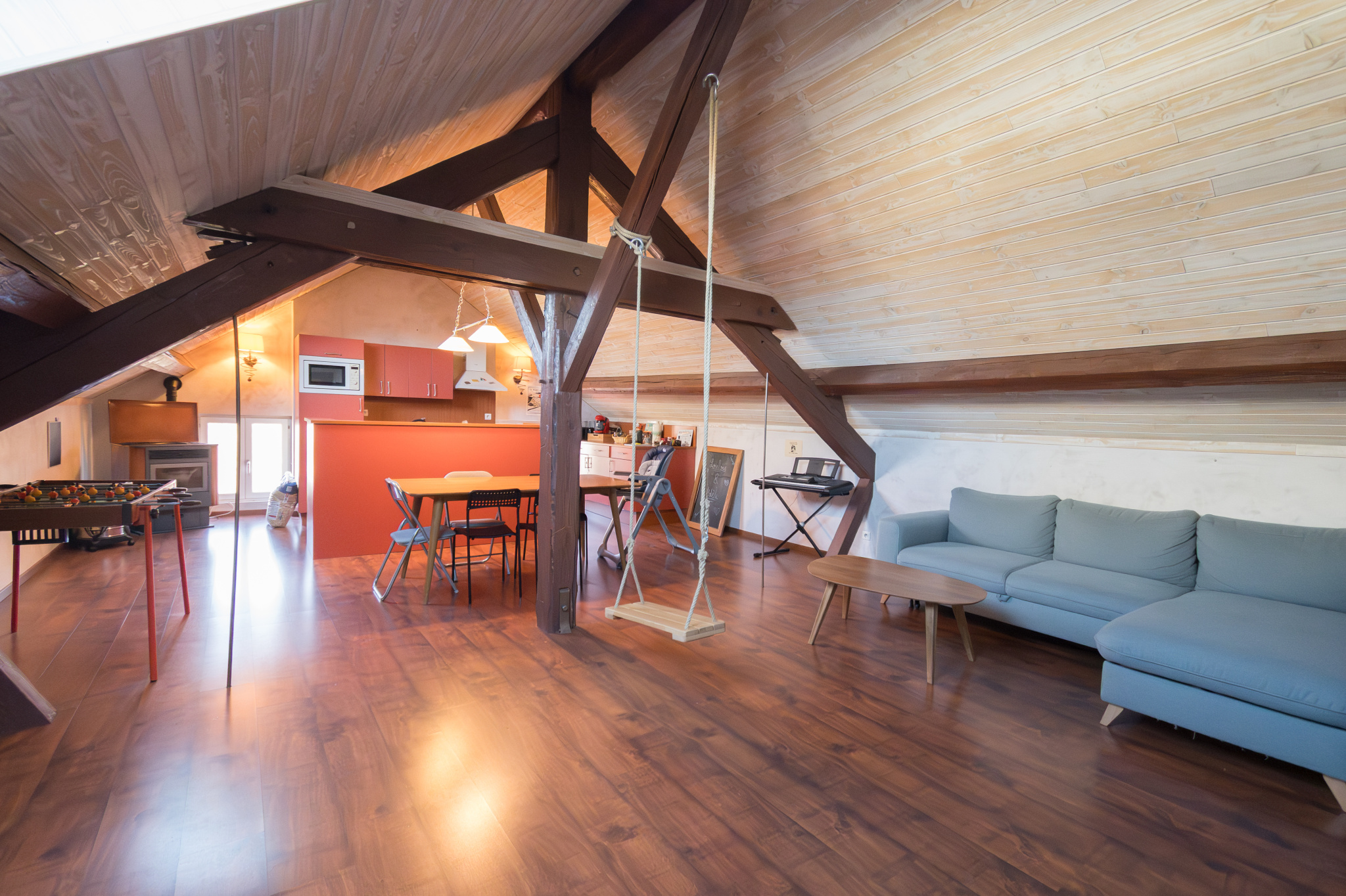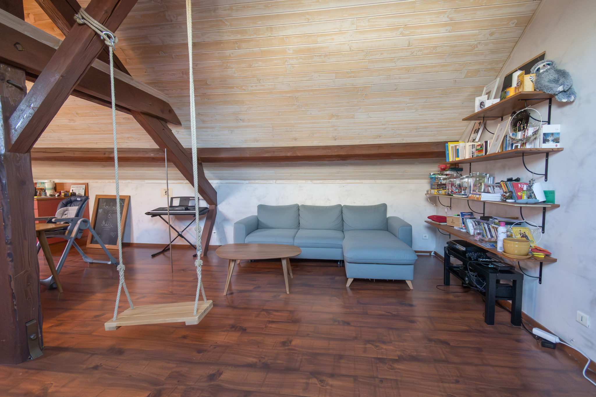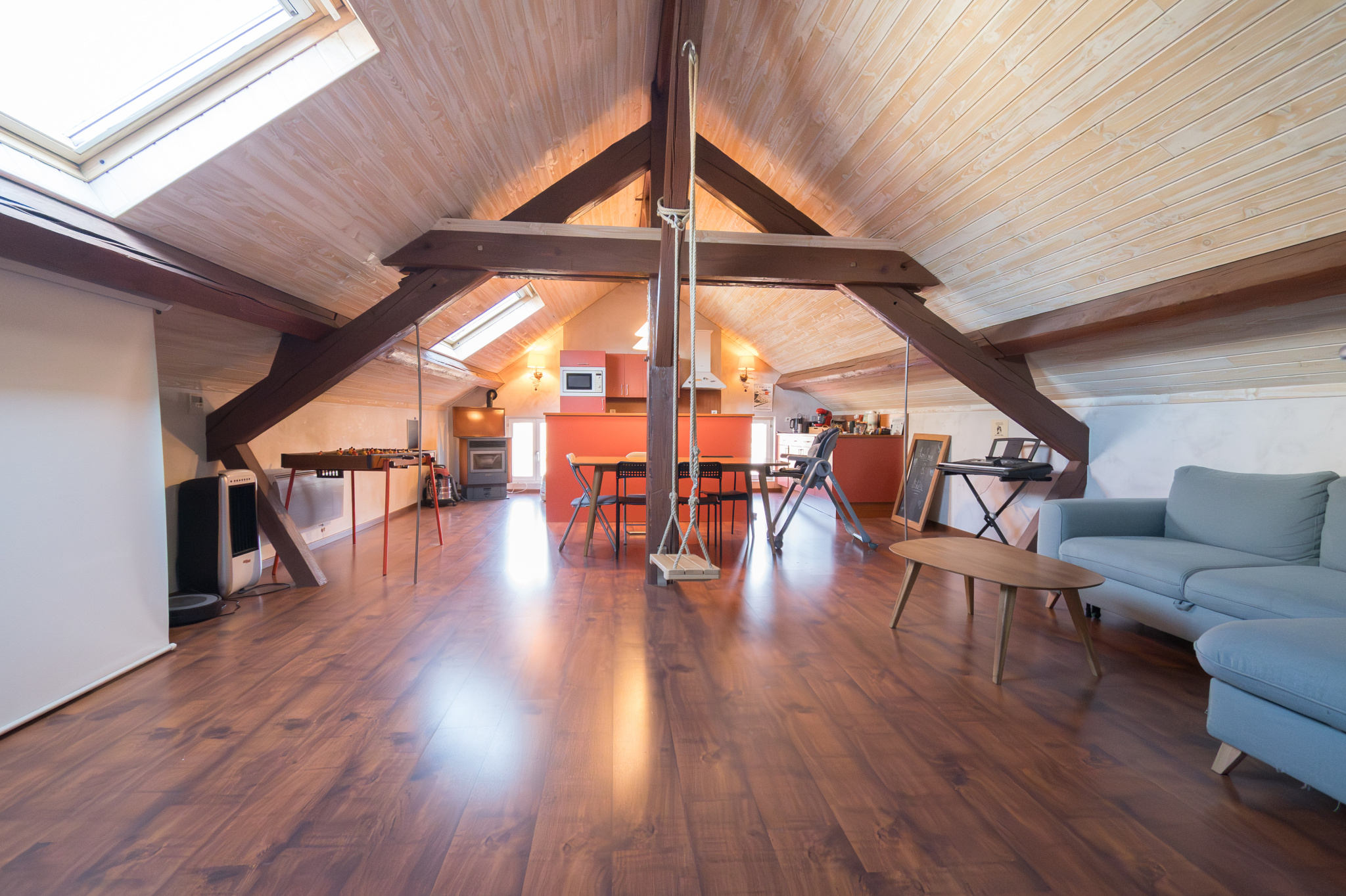 PONTARLIER - CENTRE VILLE : Appartement atypique de type 2 de 68.4m2 dans une petite copropriété calme rénové en 2005. L'appartement se compose d'une entrée, une vaste cuisine ouverte sur séjour de 34m2, une chambre, wc avec buanderie, une salle de bains et une cave. Poêle à granulé.