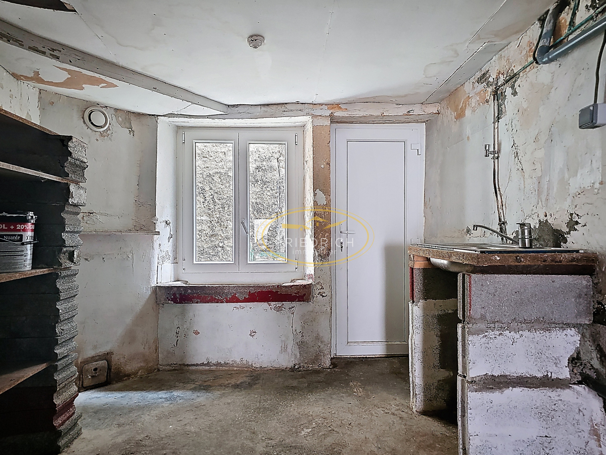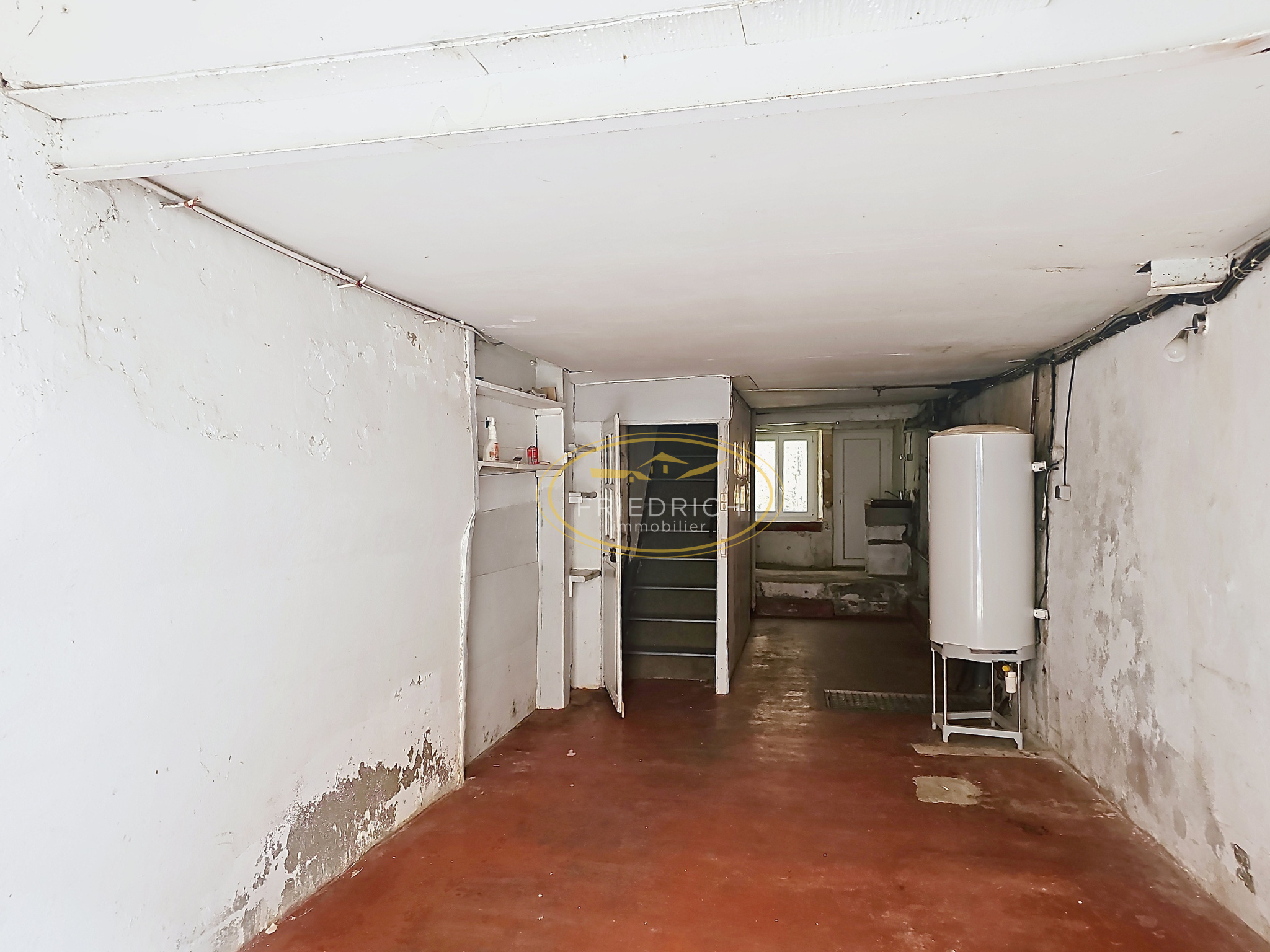 - Garage/buanderie (33m2) : sol béton, cumulus 200L (~2022), évier, ancienne pierre à eau, fenêtre ;