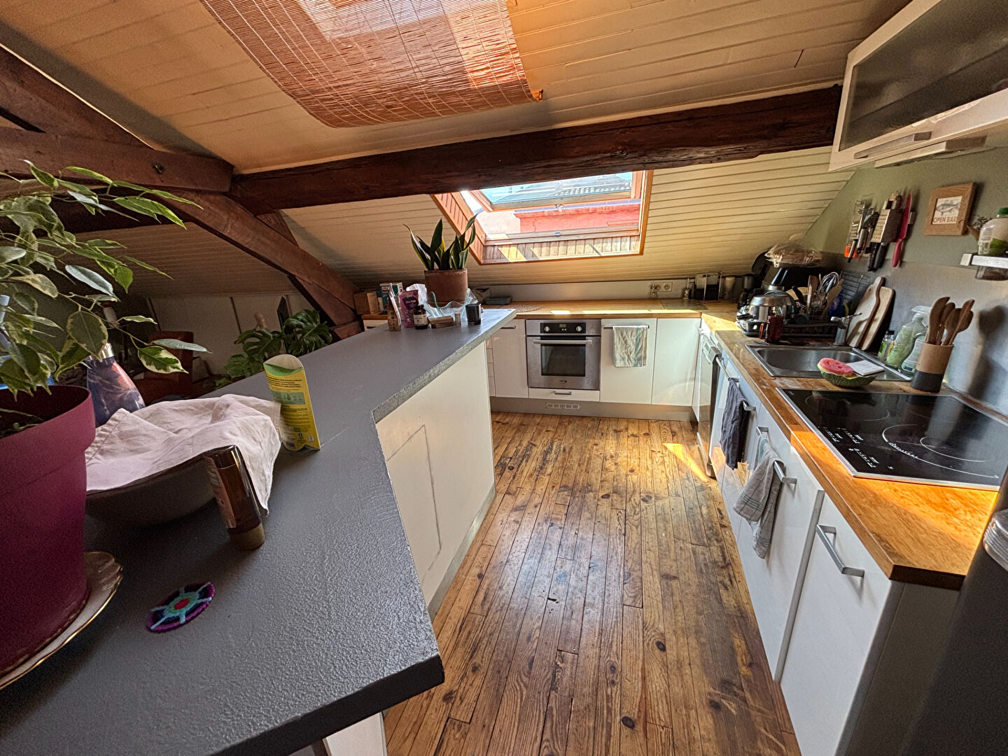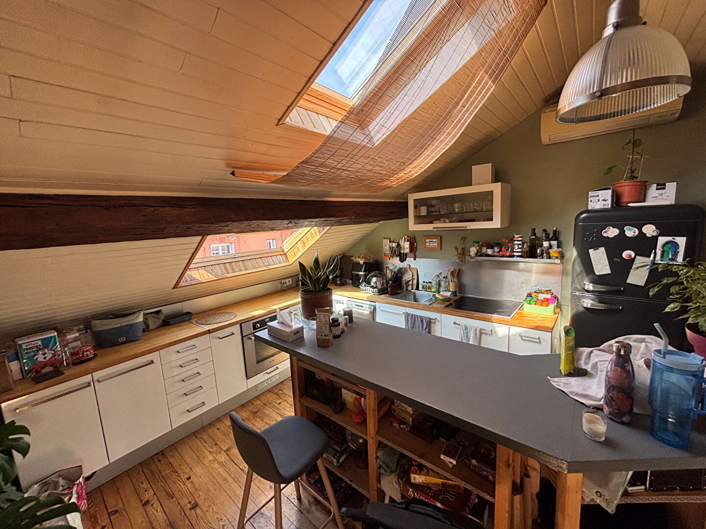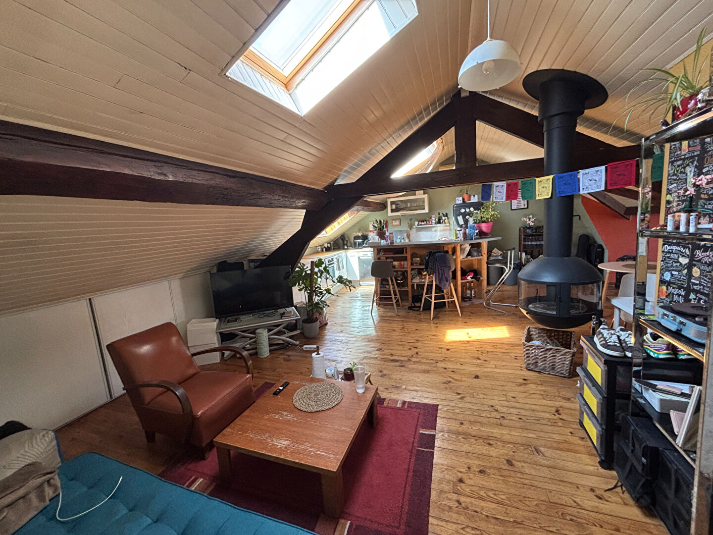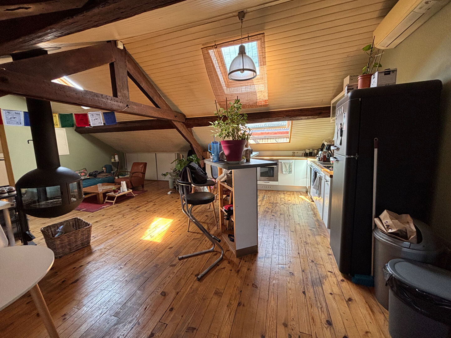 Baigné de lumière, l'appartement offre un très bel espace de vie chaleureux, sublimé par un parquet en bois et un poêle à bois donnant une atmosphère cosy et authentique.