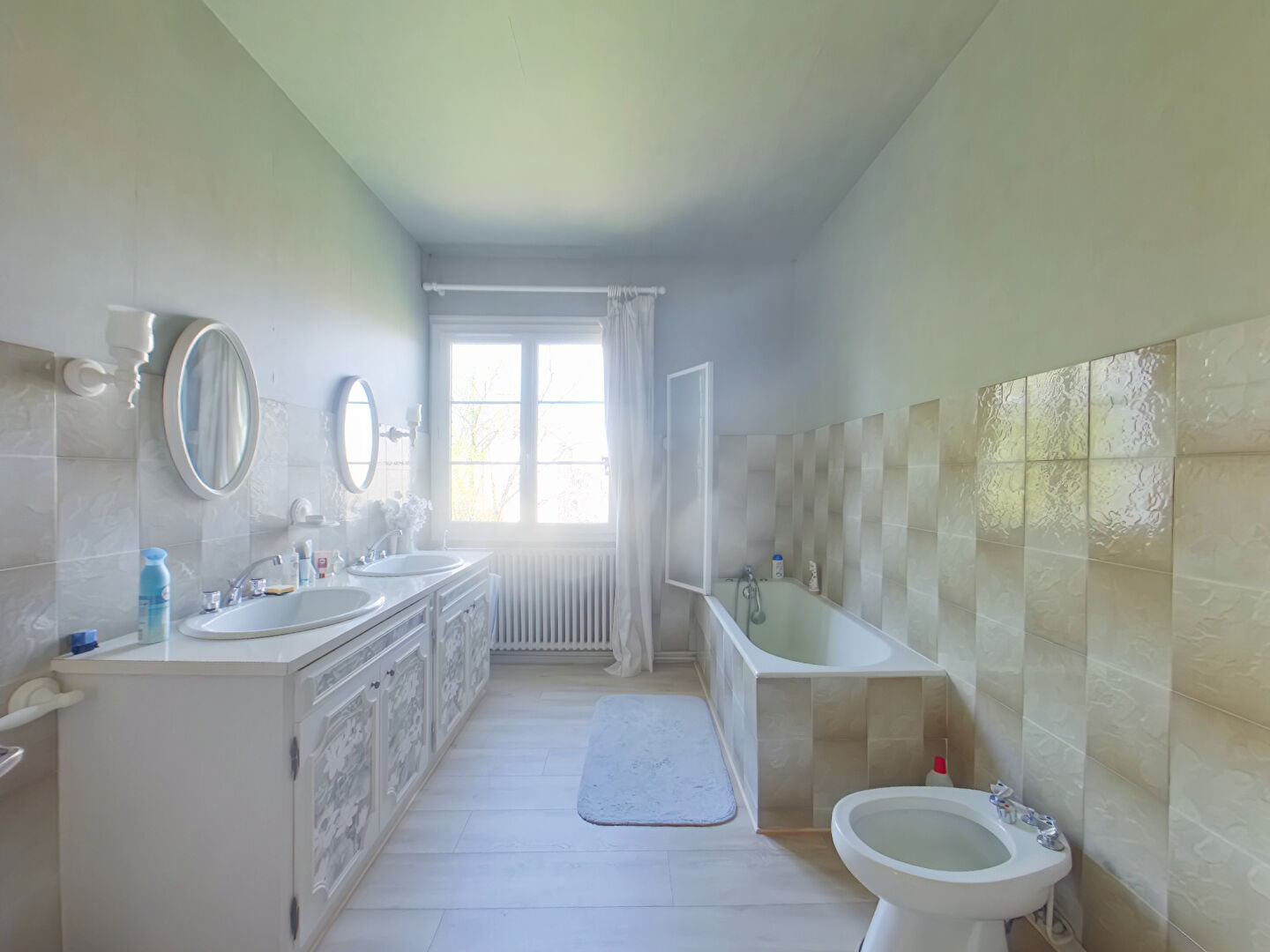 une salle de bains avec double vasque et baignoire, accessible depuis une chambre ou depuis la salle de jeux.