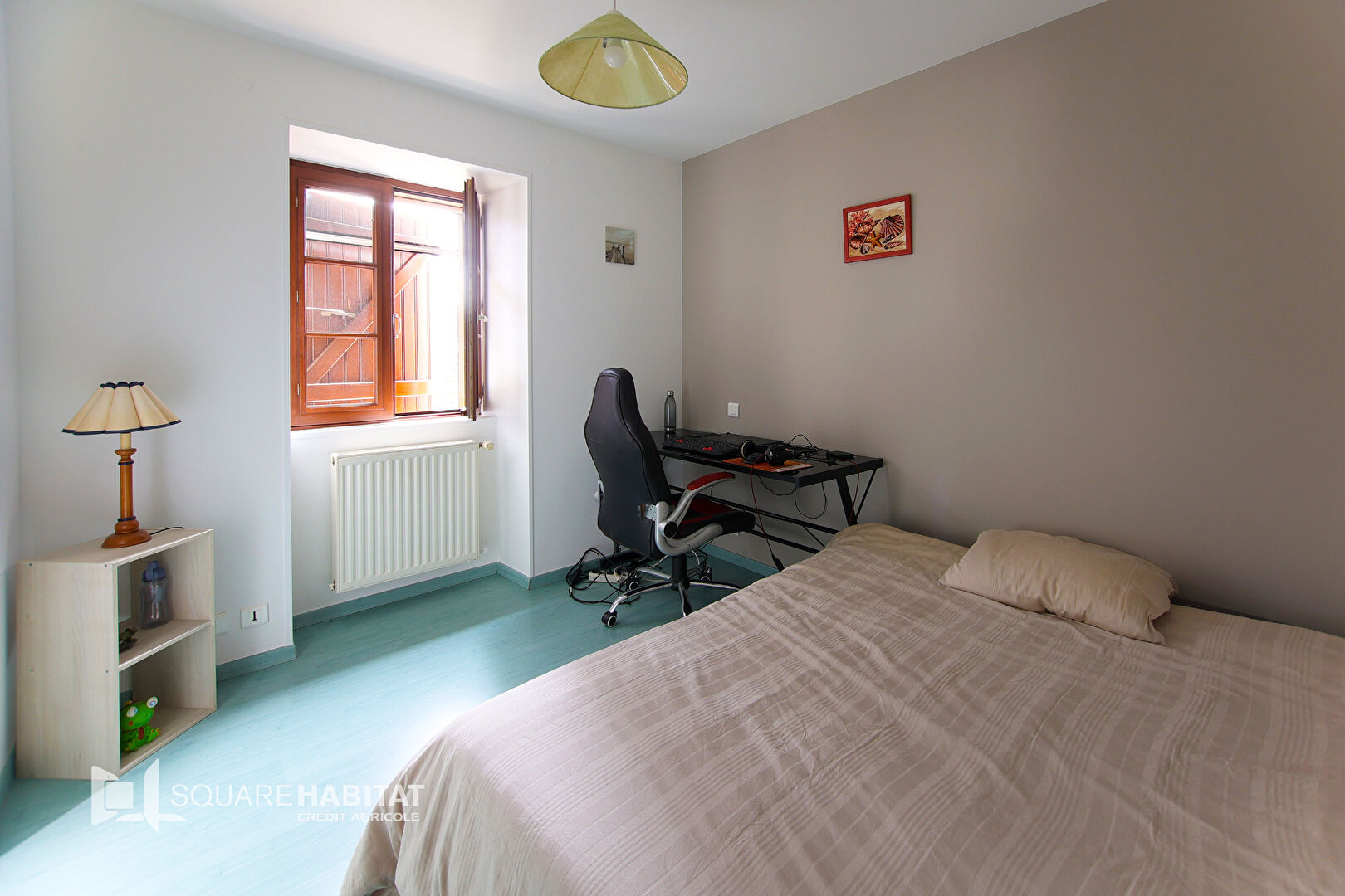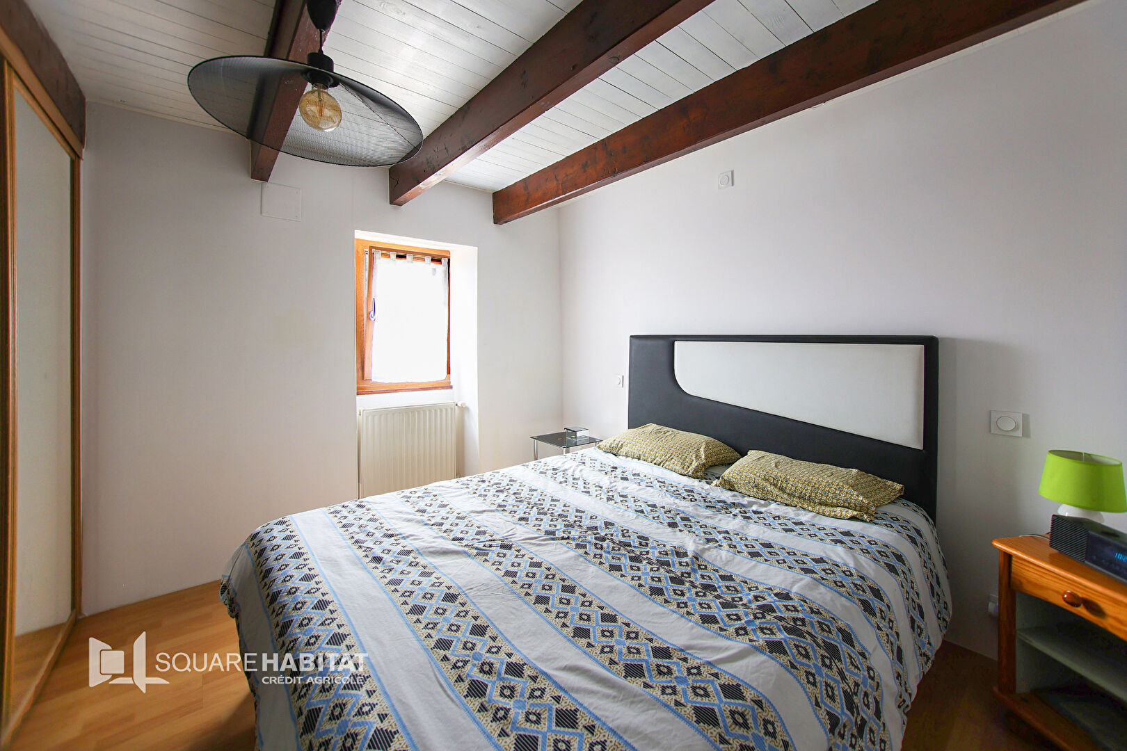 À l'étage, une belle mezzanine avec poutres apparentes crée un espace ouvert plein de charme.