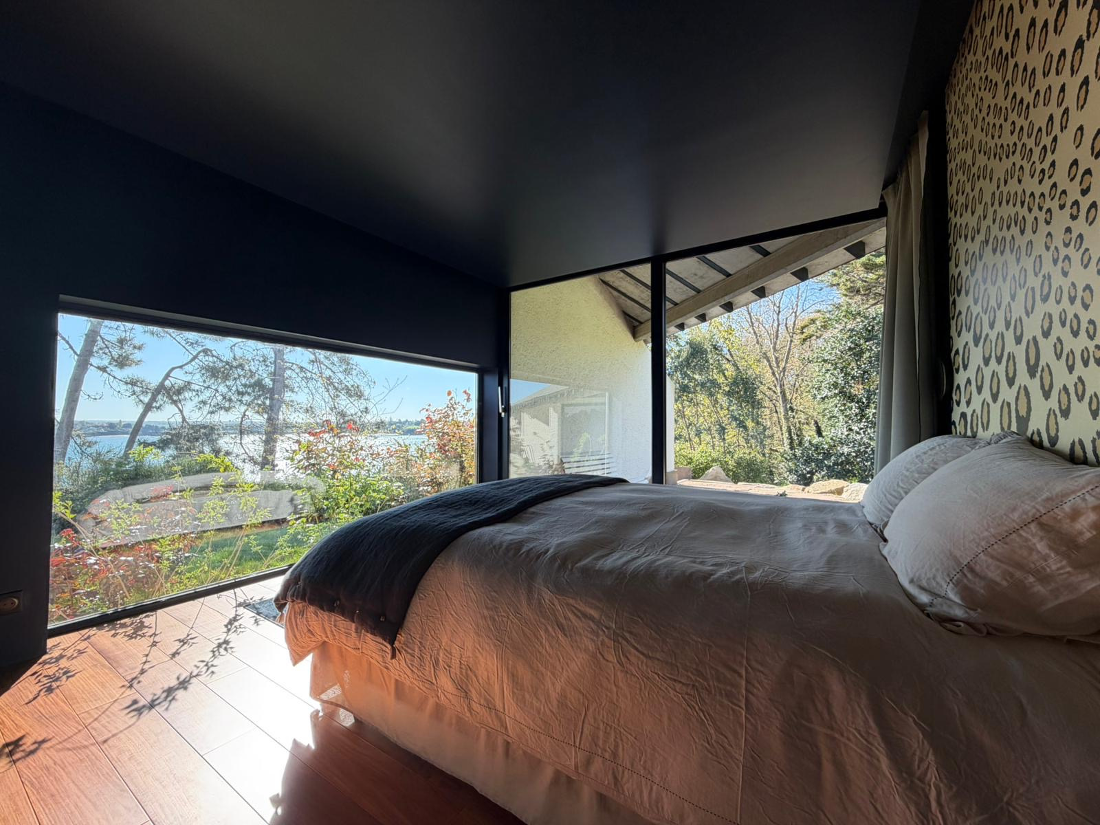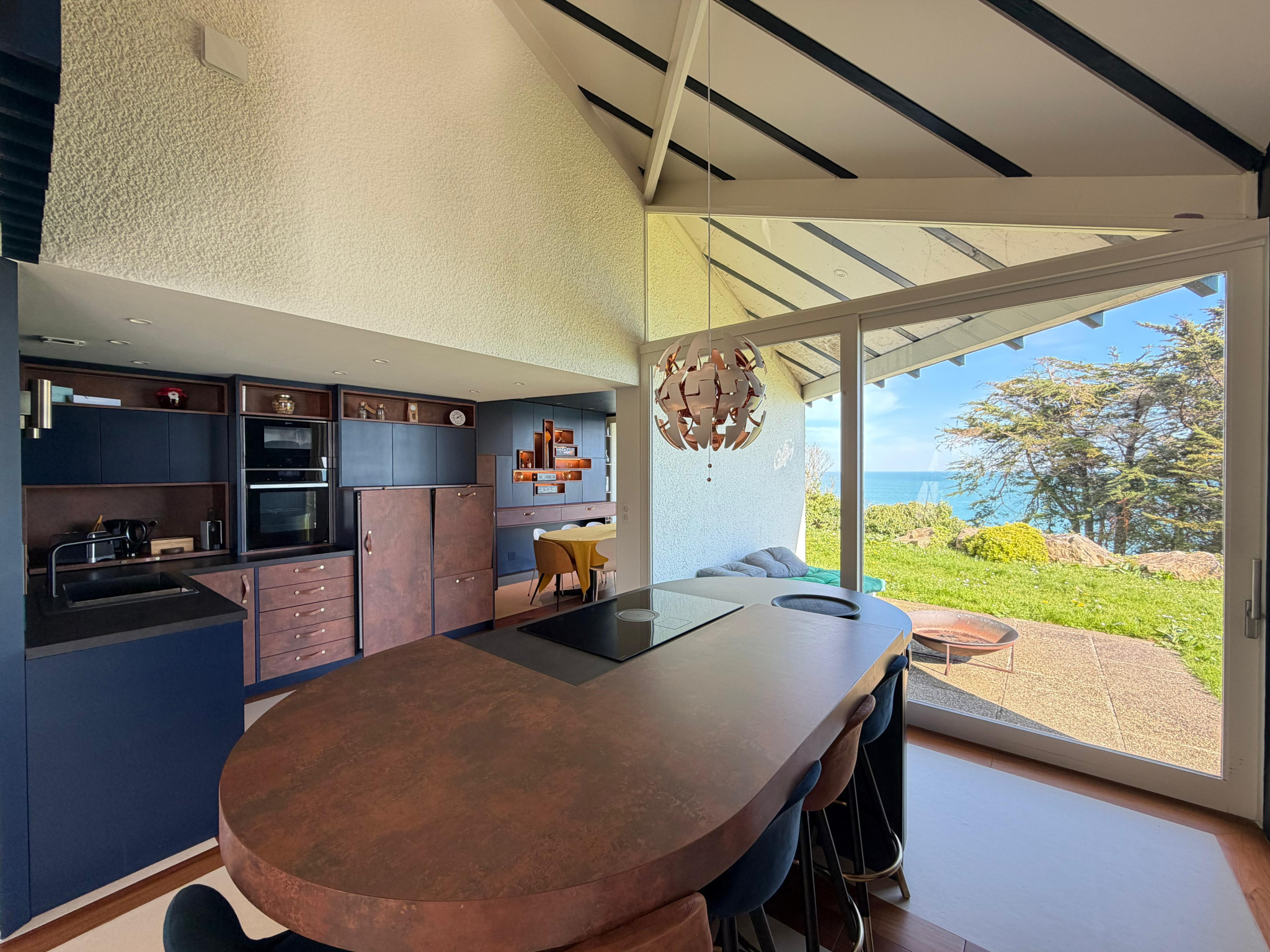 Dès l'entrée, le charme opère : volumes généreux, luminosité omniprésente et larges ouvertures invitant la mer à l'intérieur. Le vaste espace de vie, baigné de lumière, se compose d'un salon, d'une salle à manger et d'une élégante cuisine ouverte, parfaitement intégrée pour des moments de convivialité face à l'horizon.