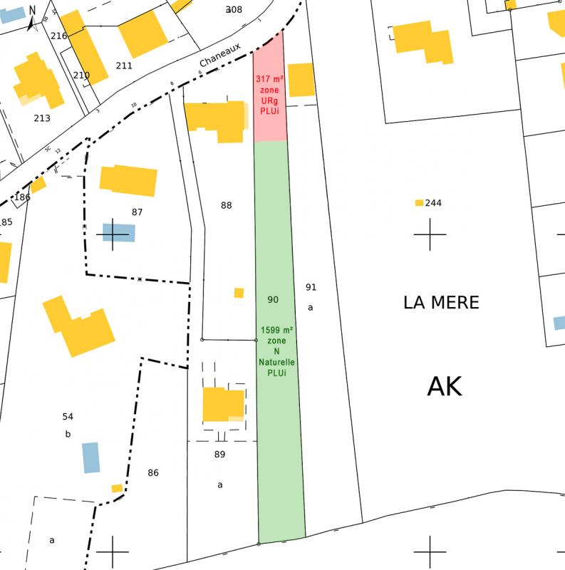 Beau terrain de 1 916 m², dont 317 m² en zone URg constructible selon le PLUi, et 1 599 m² en zone naturelle non constructible. Exposition sud, avec verdure et présence d'arbres.
