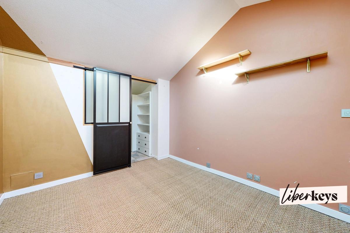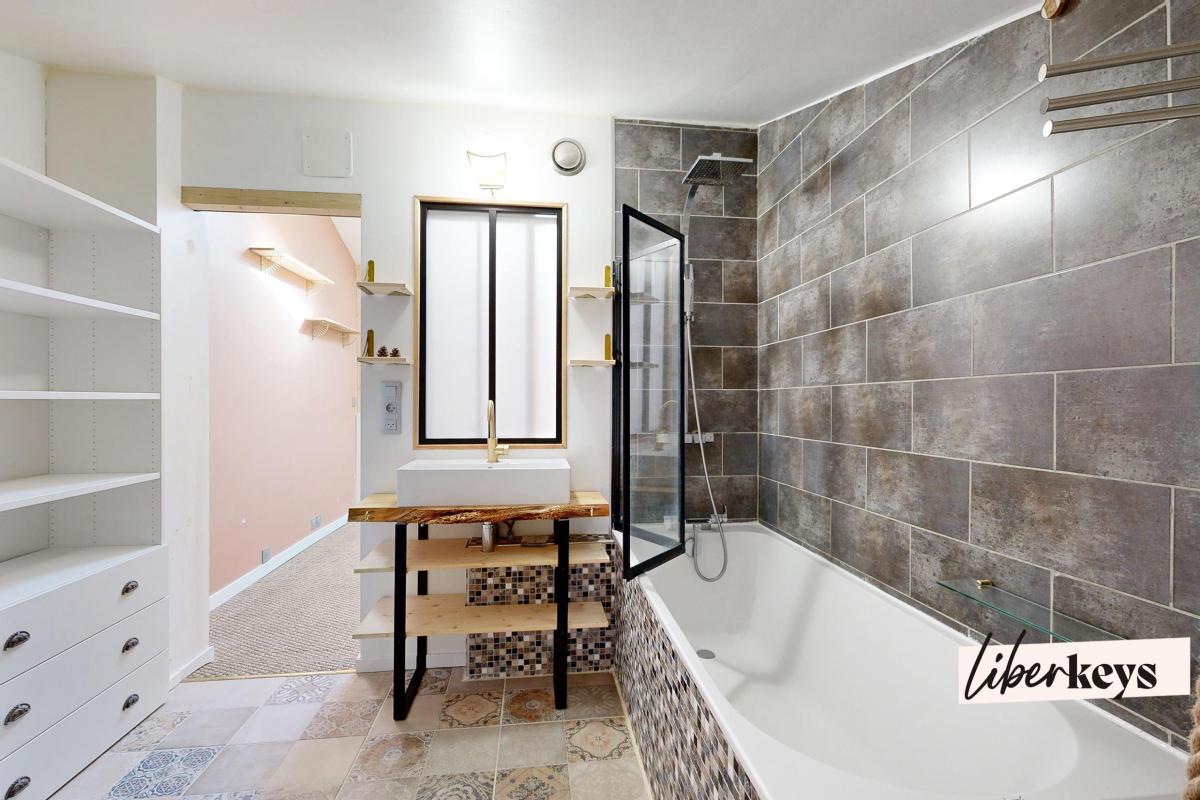 La chambre à l'étage avec dressing apporte du cachet et optimise les volumes, tandis que la salle de bains refaite à neuf avec baignoire complète harmonieusement l'ensemble.