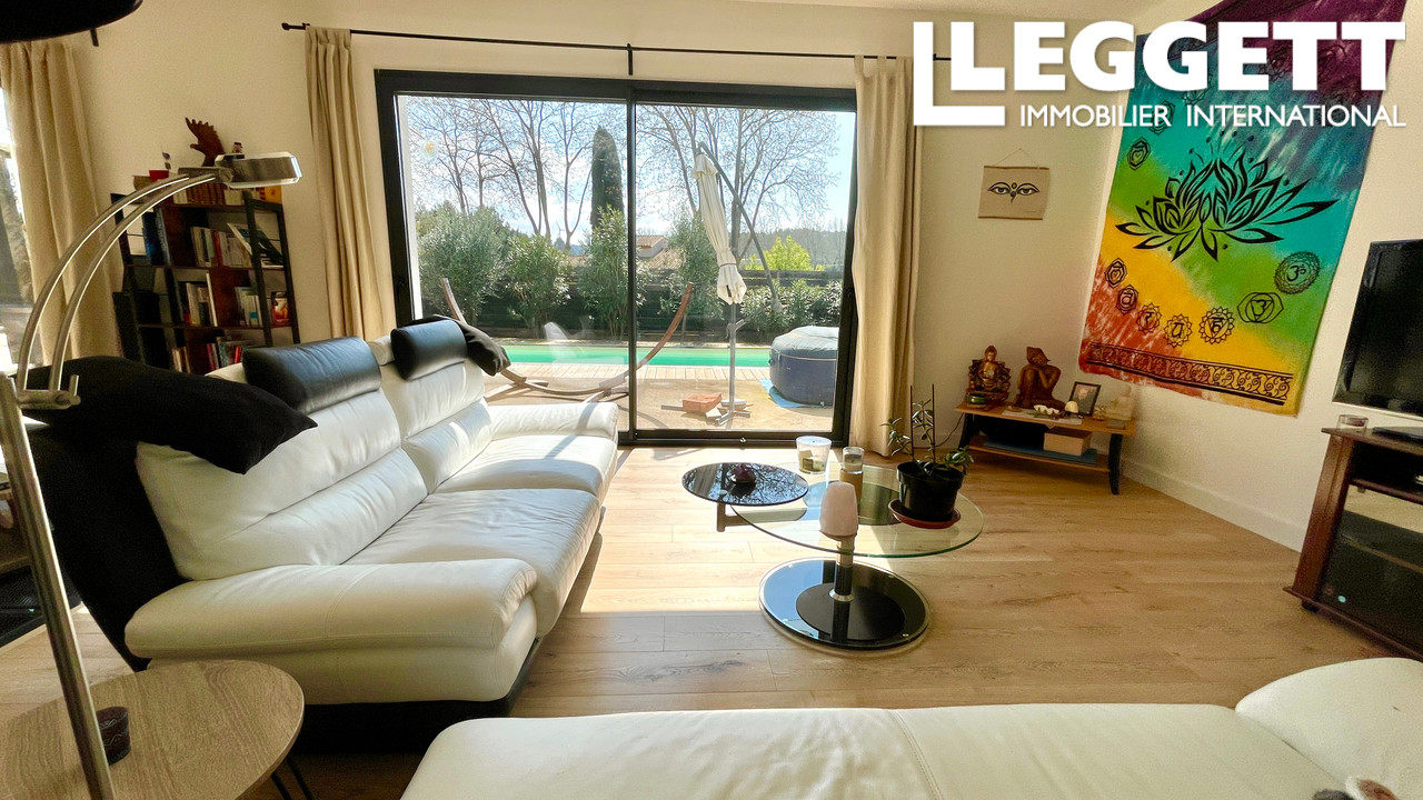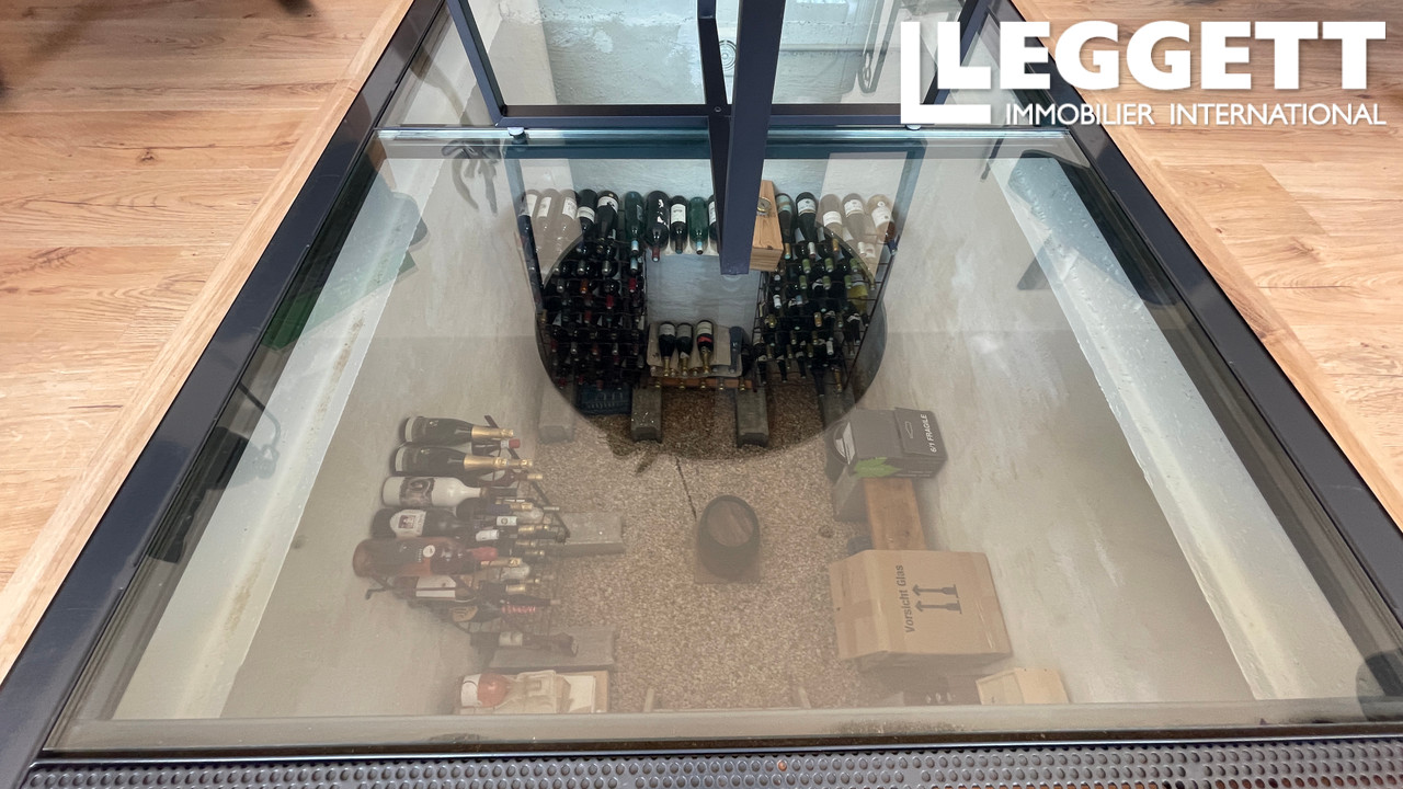A43635SAB11 - En entrant dans cette propriété, vous découvrez un vaste espace de vie exposé plein sud, doté de trois grandes baies vitrées coulissantes donnant sur la terrasse et la piscine. Cet espace comprend une cuisine entièrement équipée avec un îlot central et un cellier avec arrivée d'eau pour lave-linge. Au centre se trouve la salle à manger, et à l'autre extrémité, le salon. Au centre de cette pièce se trouvent un poêle à bois et une cave sous le plancher, dont le sol est en verre et praticable.