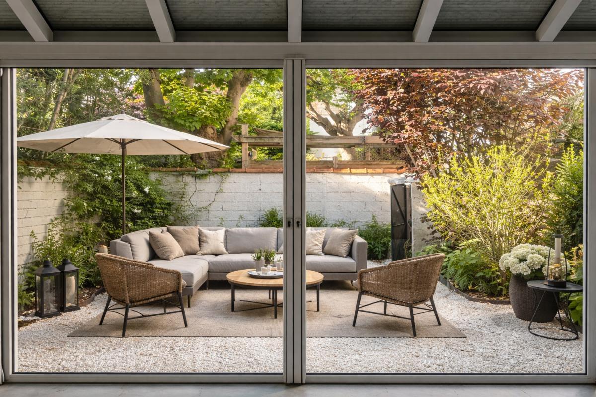 A l'arrière de la maison, un jardin très au calme qui constitue un véritable prolongement de l'espace de vie et à l'avant, en retrait par rapport à la rue, un second espace.