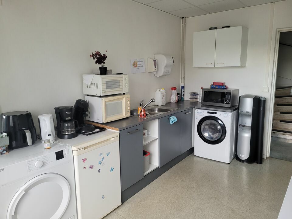 * Hauteur de 5,50 à 6,40 m.- une partie bureaux en R+1 (229 m² env.) : au rez-de-chaussée (76 m²), une entrée, un bureau, une salle de réunion et un réfectoire + à l'étage (153 m²), un pallier, 2 sanitaires, 4 bureaux et un grand espace à plusieurs postes de bureaux.