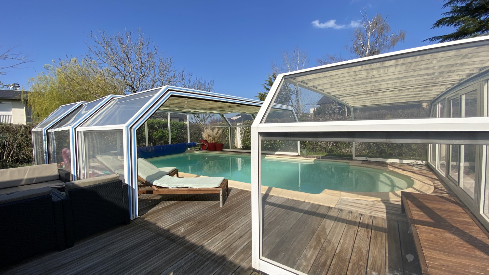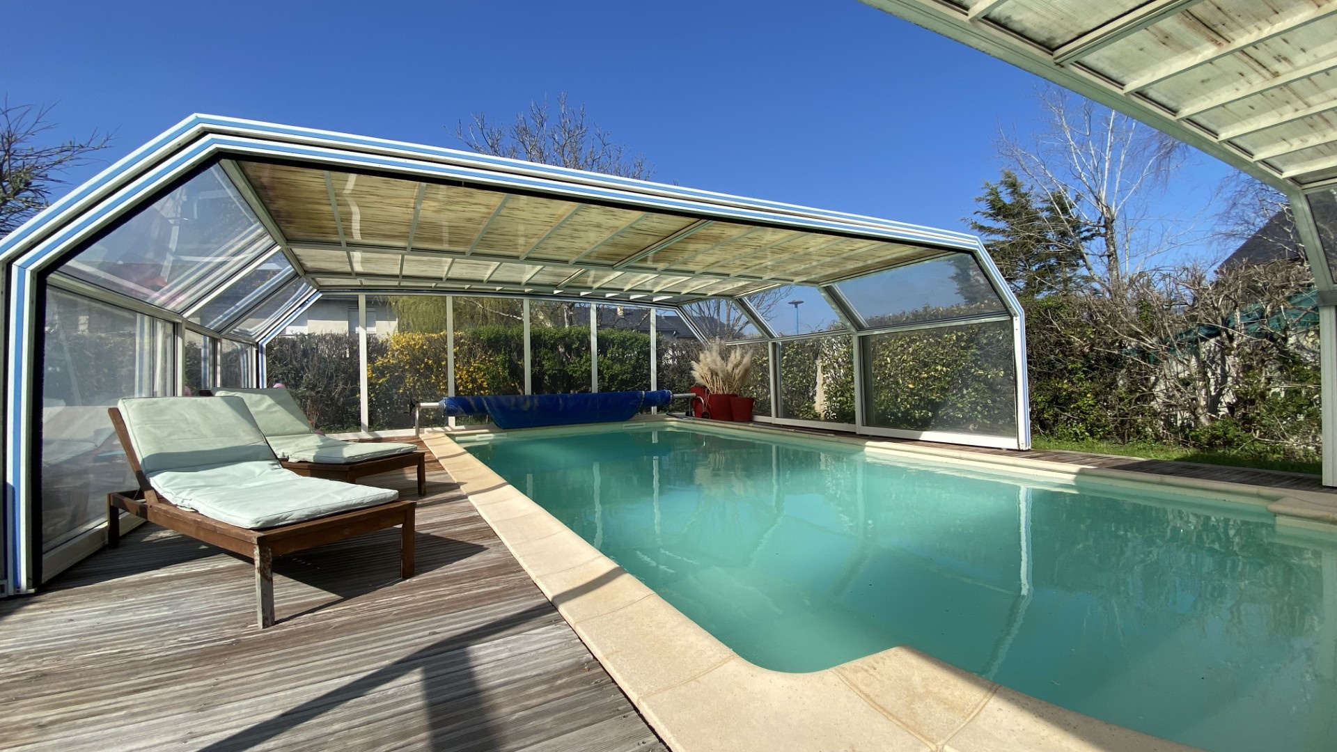 Les prestations de cette maison ont évolué. Le chauffage électrique a été complété par un poêle à granulés et surtout une climatisation réversible qui sert aujourd'hui de système de chauffage. Les menuiseries sont en P.V.C., La couverture est en ardoise. A l'extérieur, une belle piscine ( 8 m x 4 m), couverte avec un dôme.