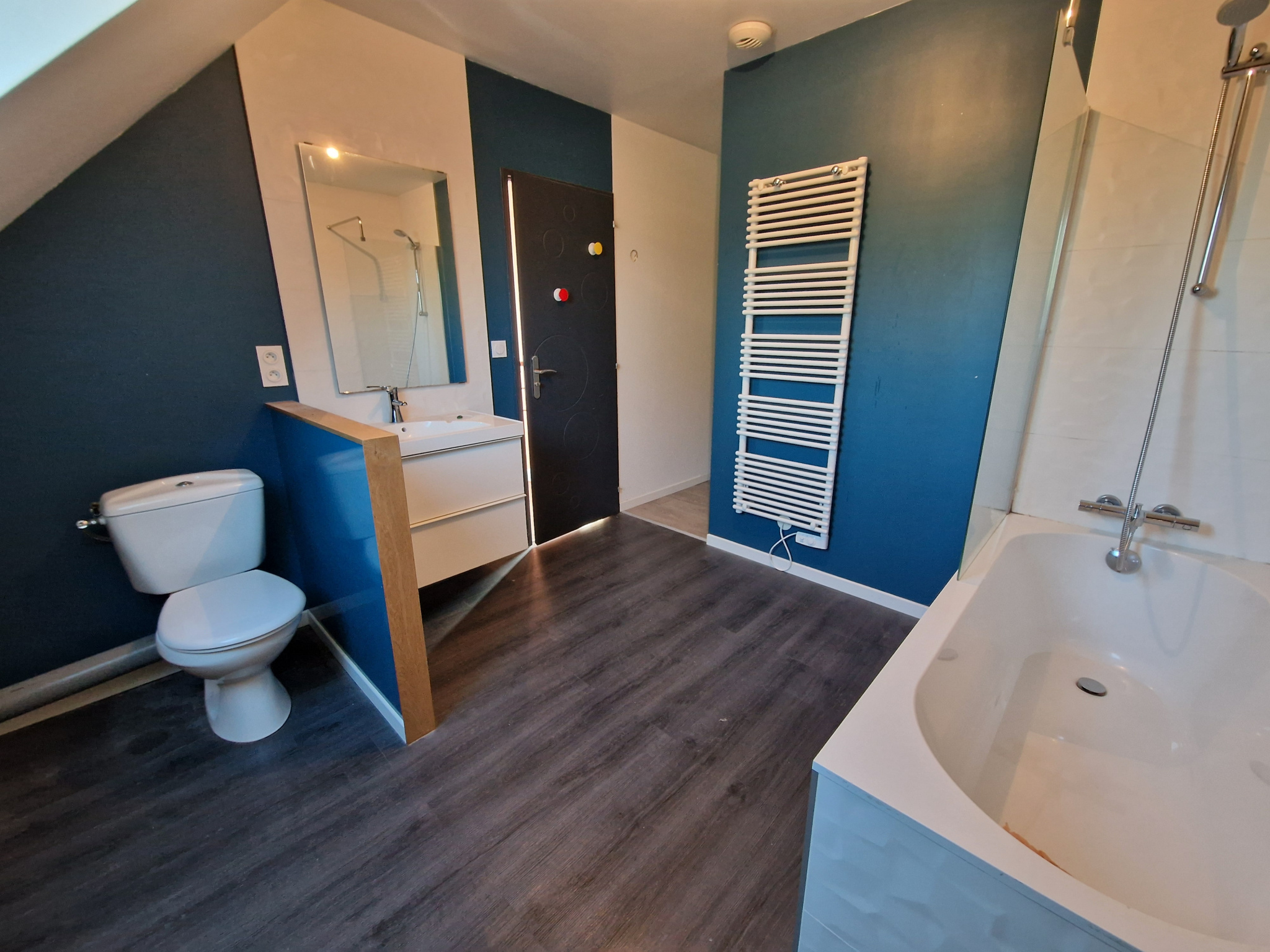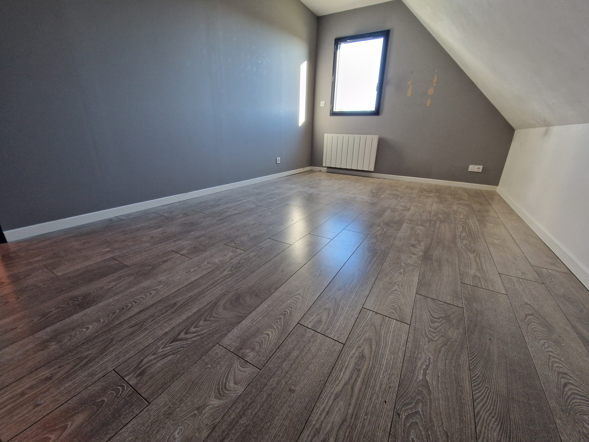 A l'étage : coin bureau en mezzanine, deux belles chambres, une salle de bains avec WC et un grand dressing.