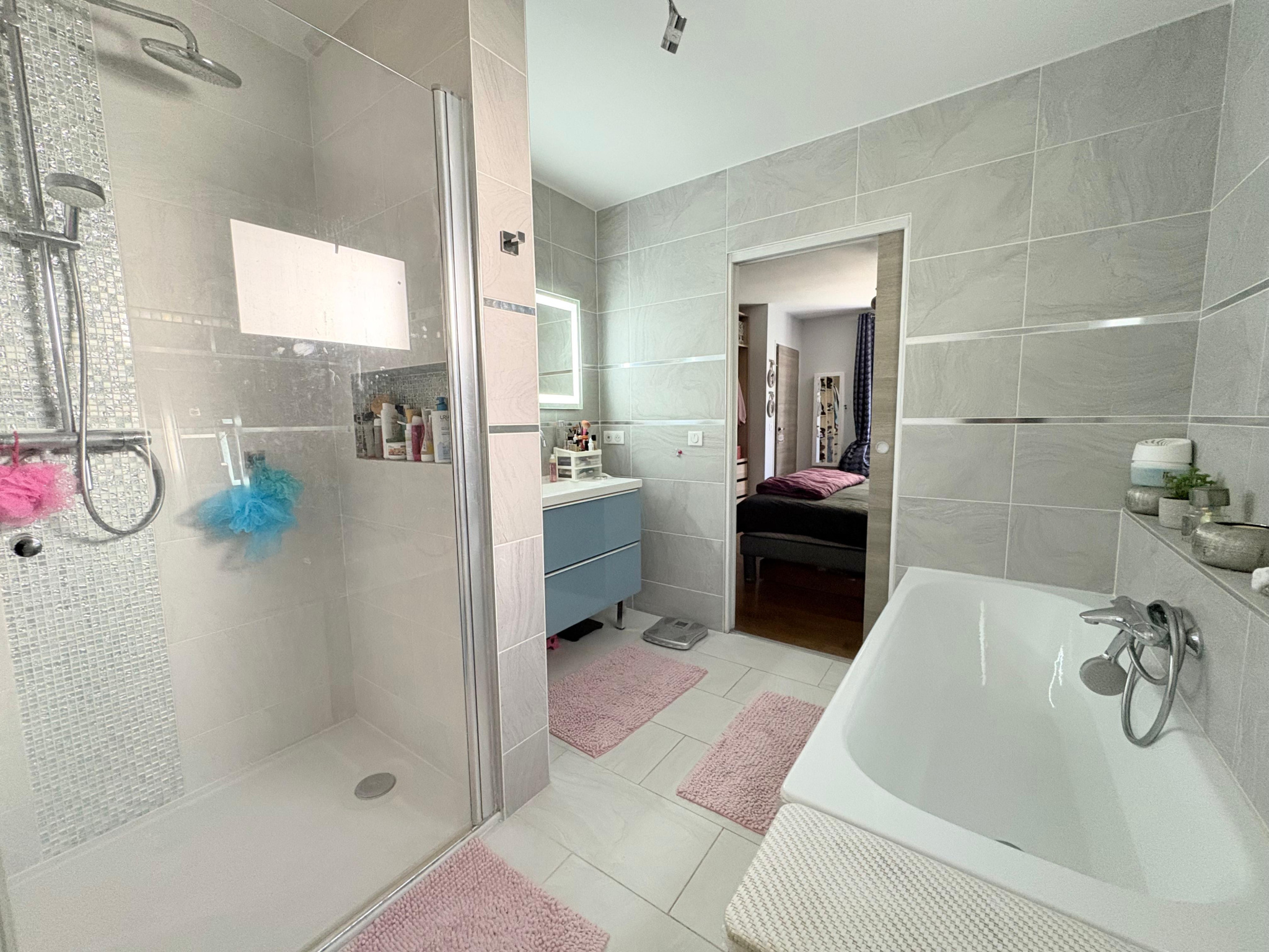Elle se compose, au rez-de-chaussée, d'une entrée, d'un séjour traversant lumineux prolongé par une superbe cuisine / salle à manger d'environ 35 m2 avec accès direct au jardin. Vous y trouverez également une suite parentale avec salle d'eau privative (baignoire et douche) ainsi qu'un WC indépendant.
