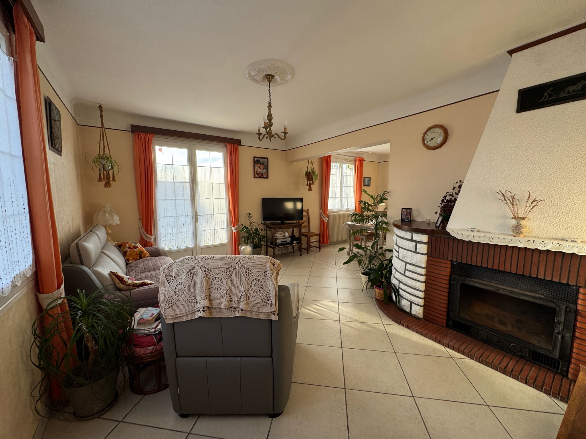 Maison de plain-pied avec un accès 2 marches comprend : une entrée, une cuisine aménagée et équipée, un salon avec cheminée-insert, une salle à manger, 3 chambres, une salle d'eau rénovée en 2016, WC, et une buanderie.