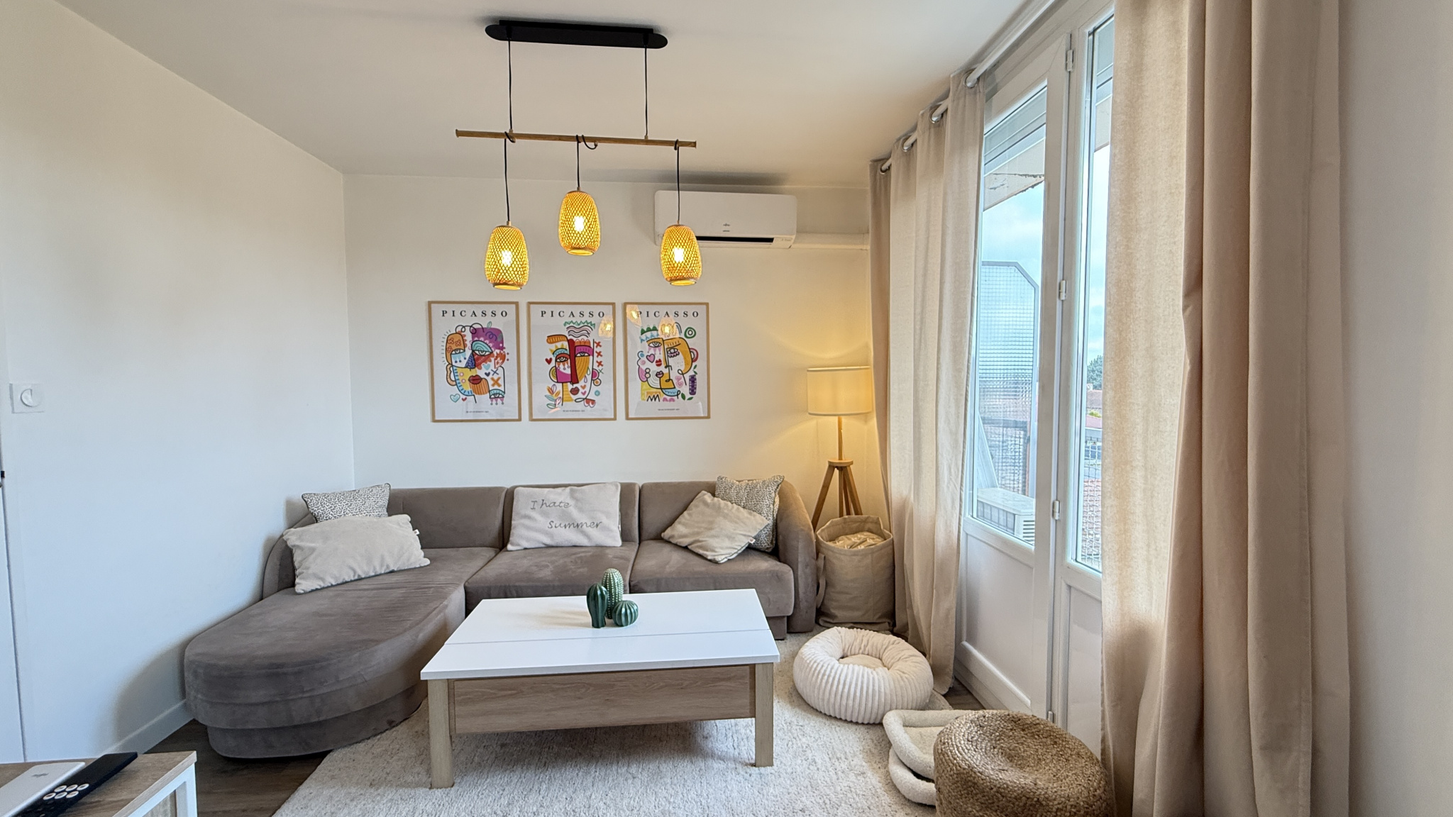 Appartement de 65 m2 offrant une entrée avec rangements, une belle pièce à vivre climatisée et lumineuse ouverte sur un balcon filant.