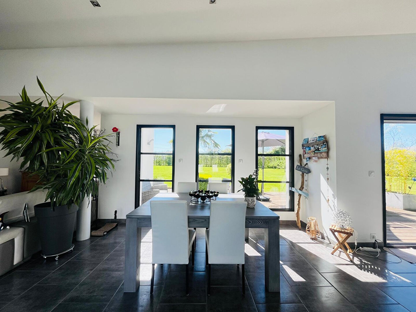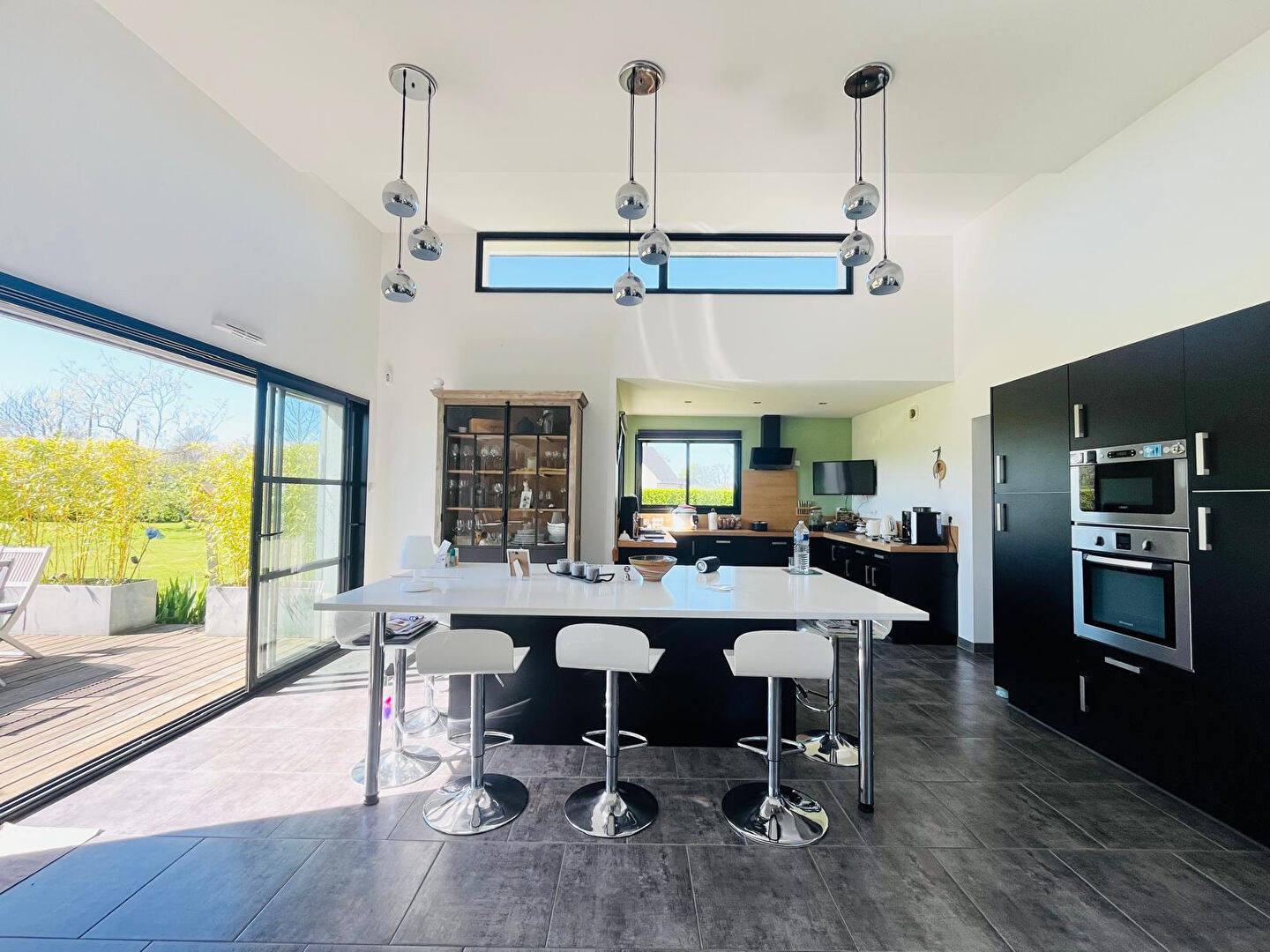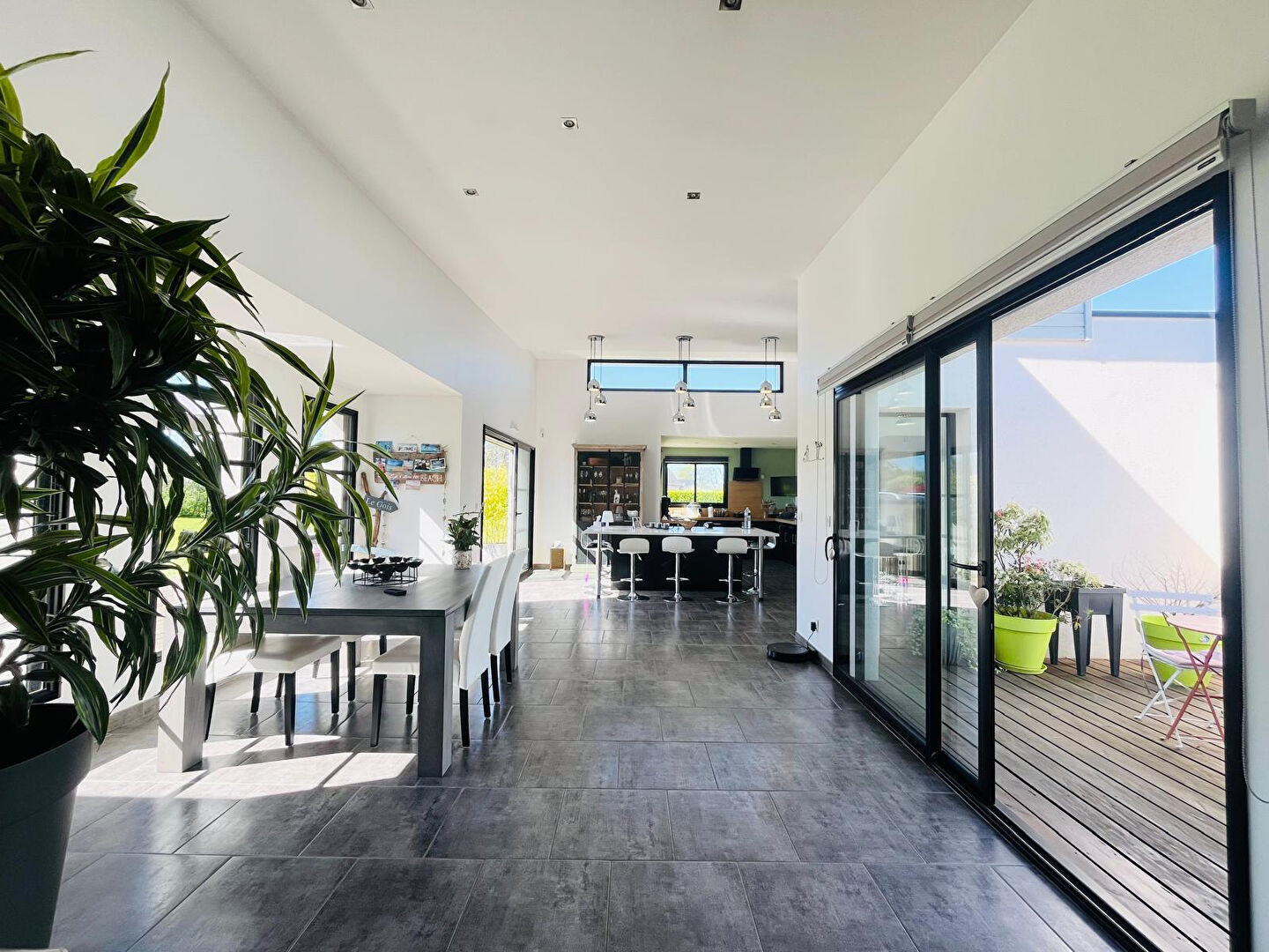 De larges ouvertures donnent, d'un côté, sur un patio et, de l'autre, sur une grande terrasse offrant une agréable vue sur le jardin, sans aucun vis-à-vis.