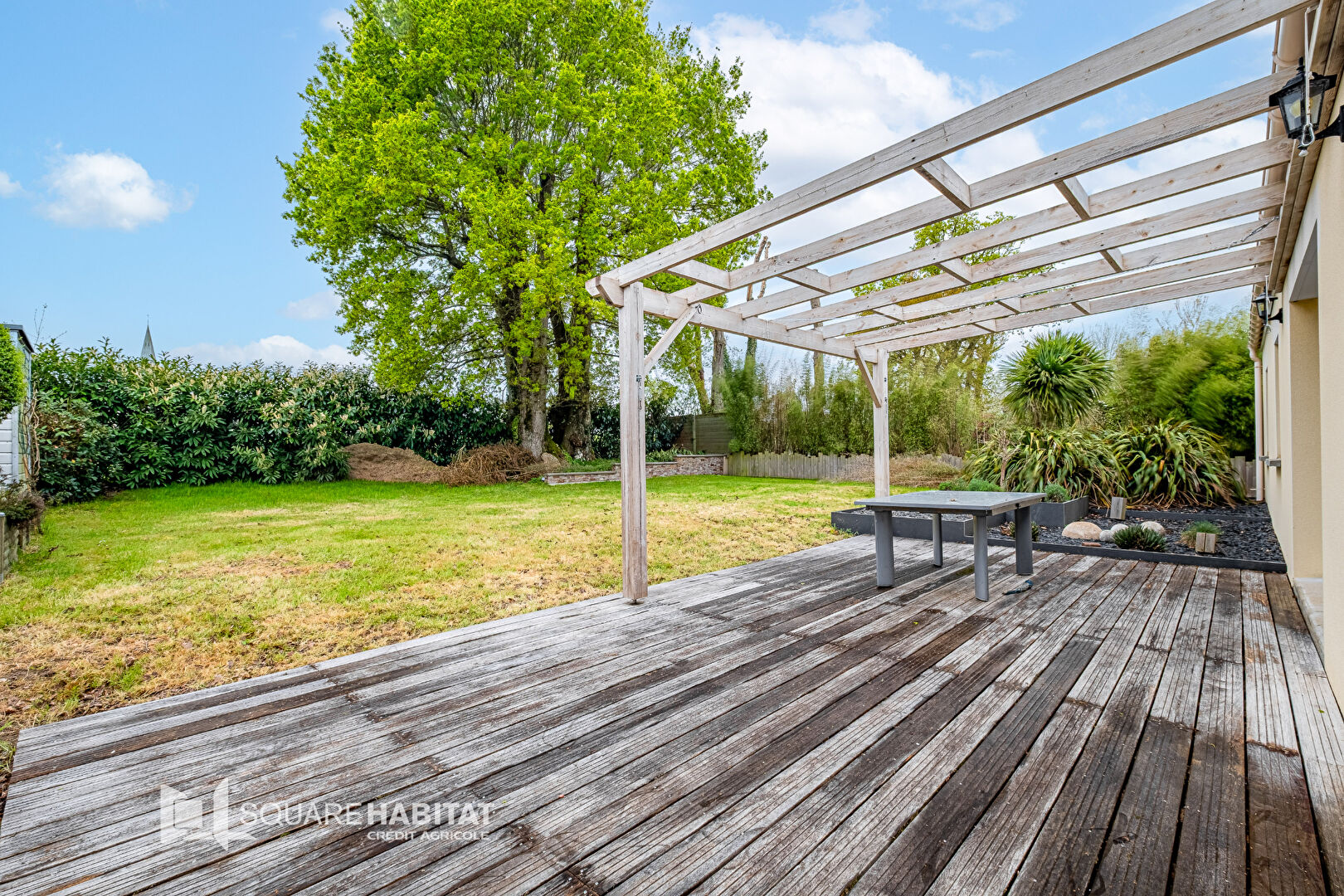 À l'extérieur, vous profiterez d'une terrasse exposée plein sud, agrémentée d'une pergola, idéale pour les beaux jours. Un second garage indépendant de 40 m² vient compléter l'ensemble.