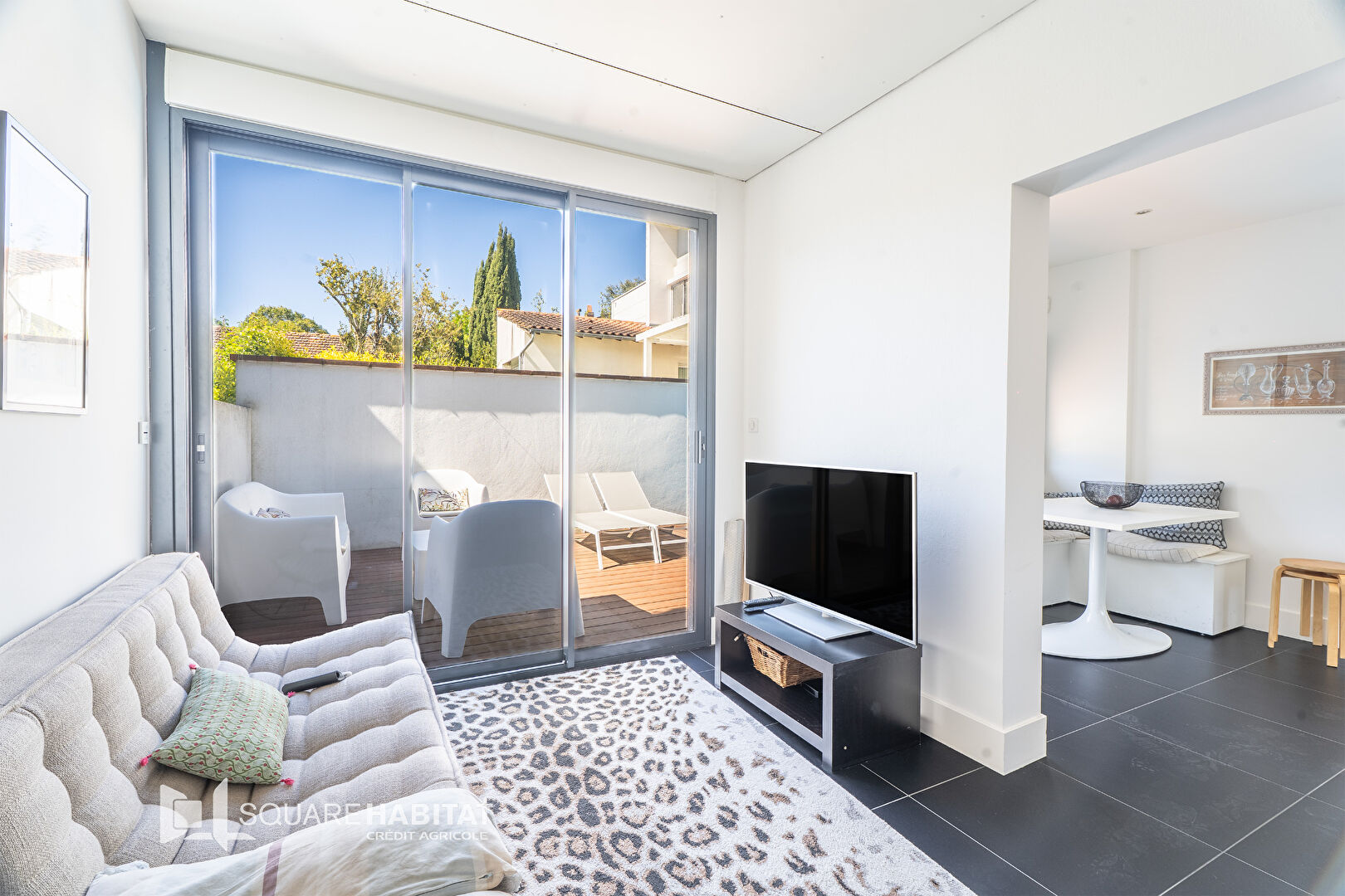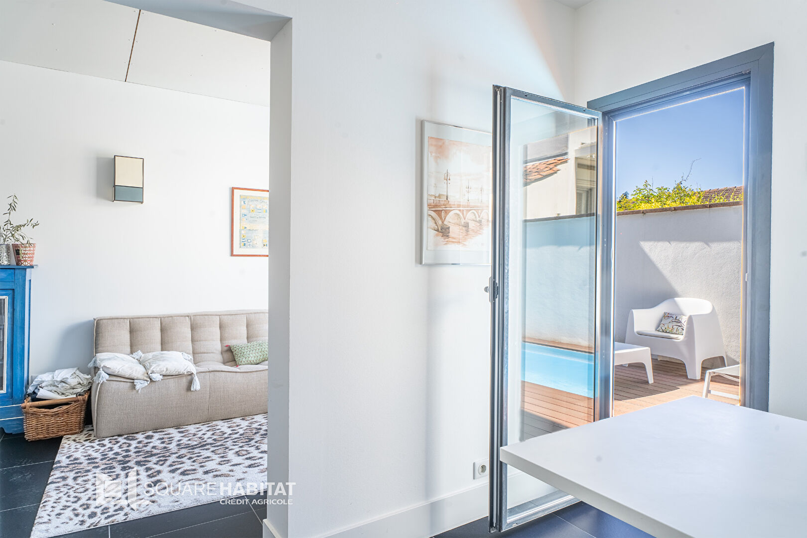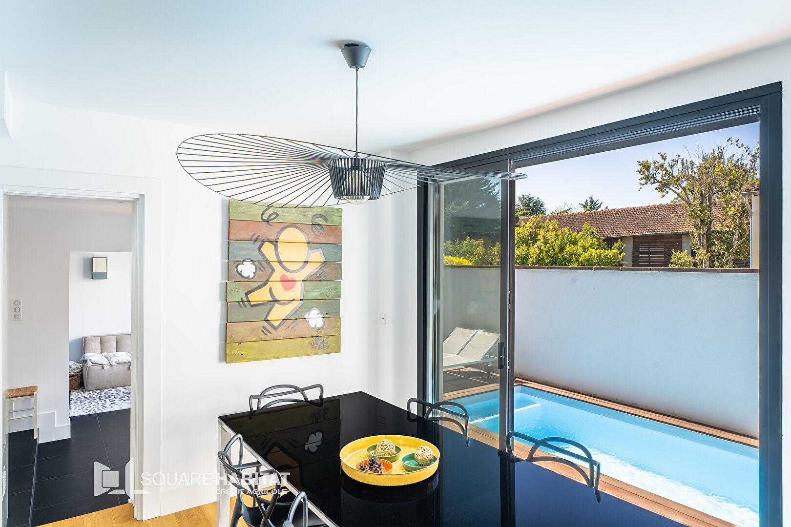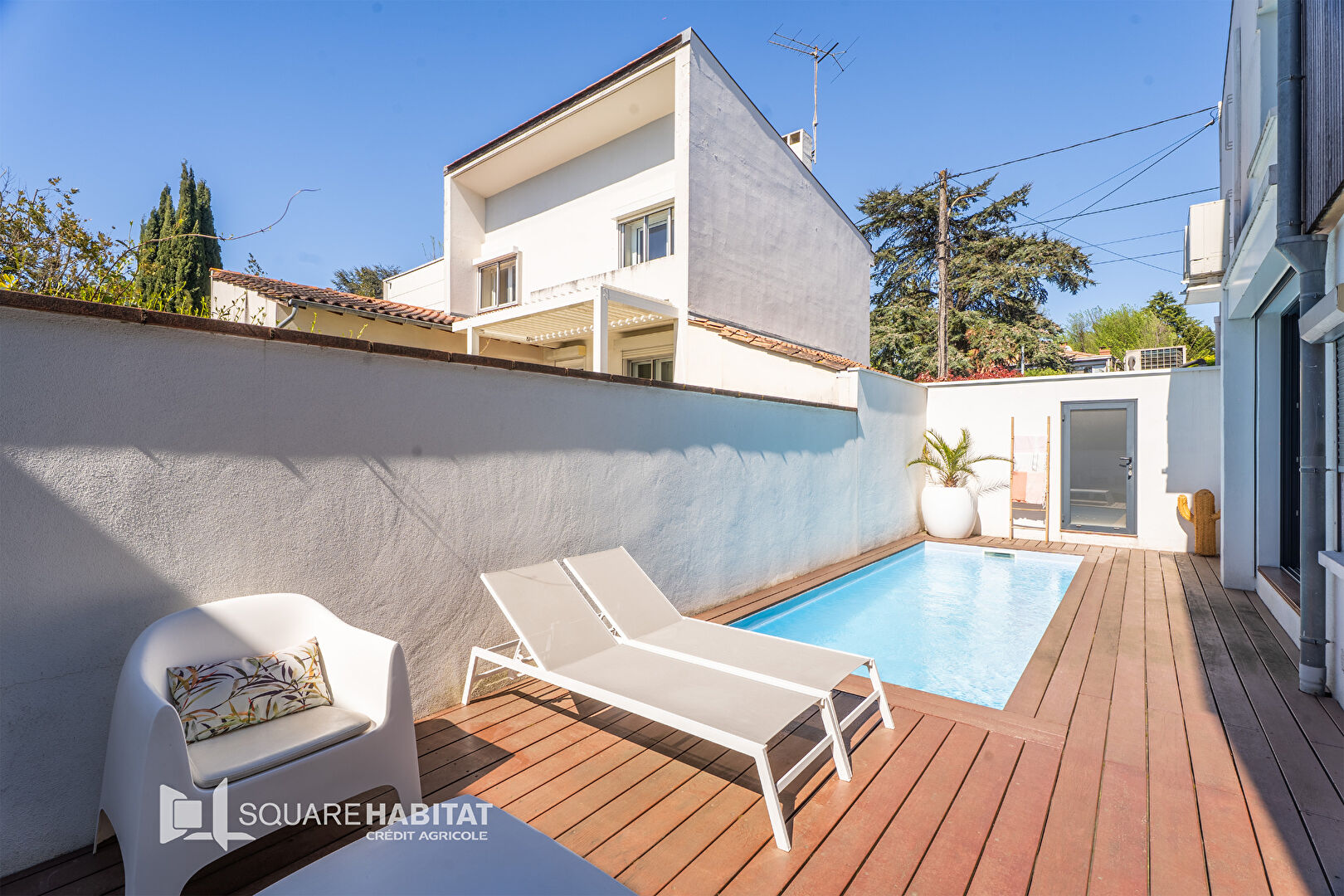 La partie extérieure se compose de plusieurs espaces arborés et une magnifique terrasse en ipé avec piscine.