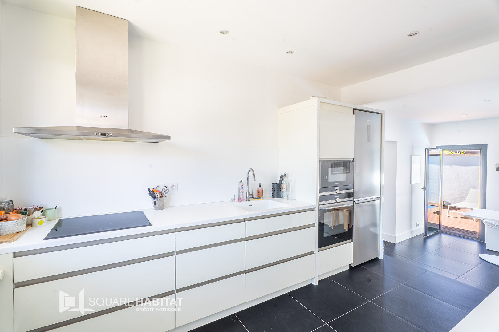 - Au rez de chaussée, une entrée, un WC, un magnifique espace de vie d'environ 50m2 avec séjour / salle à manger traversant et cuisine intégralement aménagée, un espace repas supplémentaire et un bureau de 11m2.