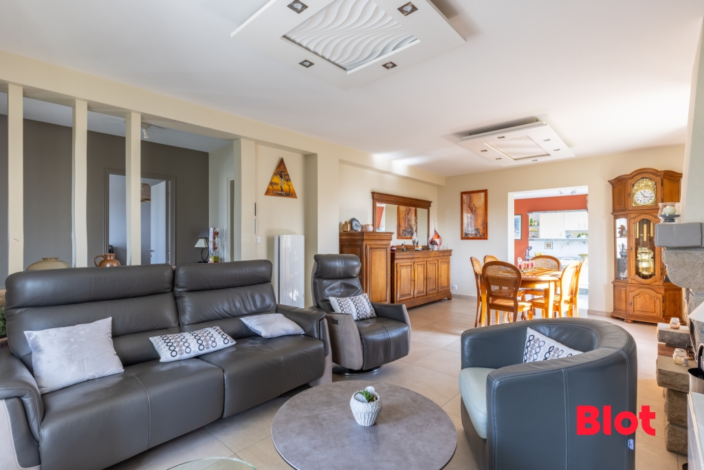 L'entrée s'ouvre sur une lumineuse pièce de vie de 28m², traversante et agrémentée d'un insert, idéale pour partager de beaux moments en famille.