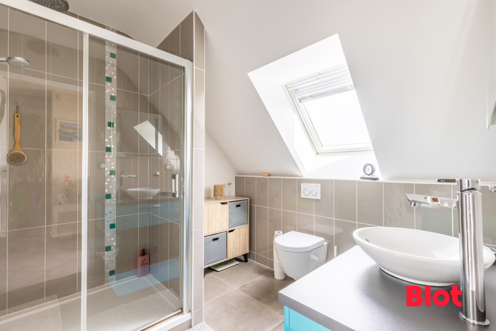 Le rez-de-chaussée dispose également d'une chambre (ou un bureau), d'un dressing et de WC séparés, offrant un vrai confort de vie au quotidien.
