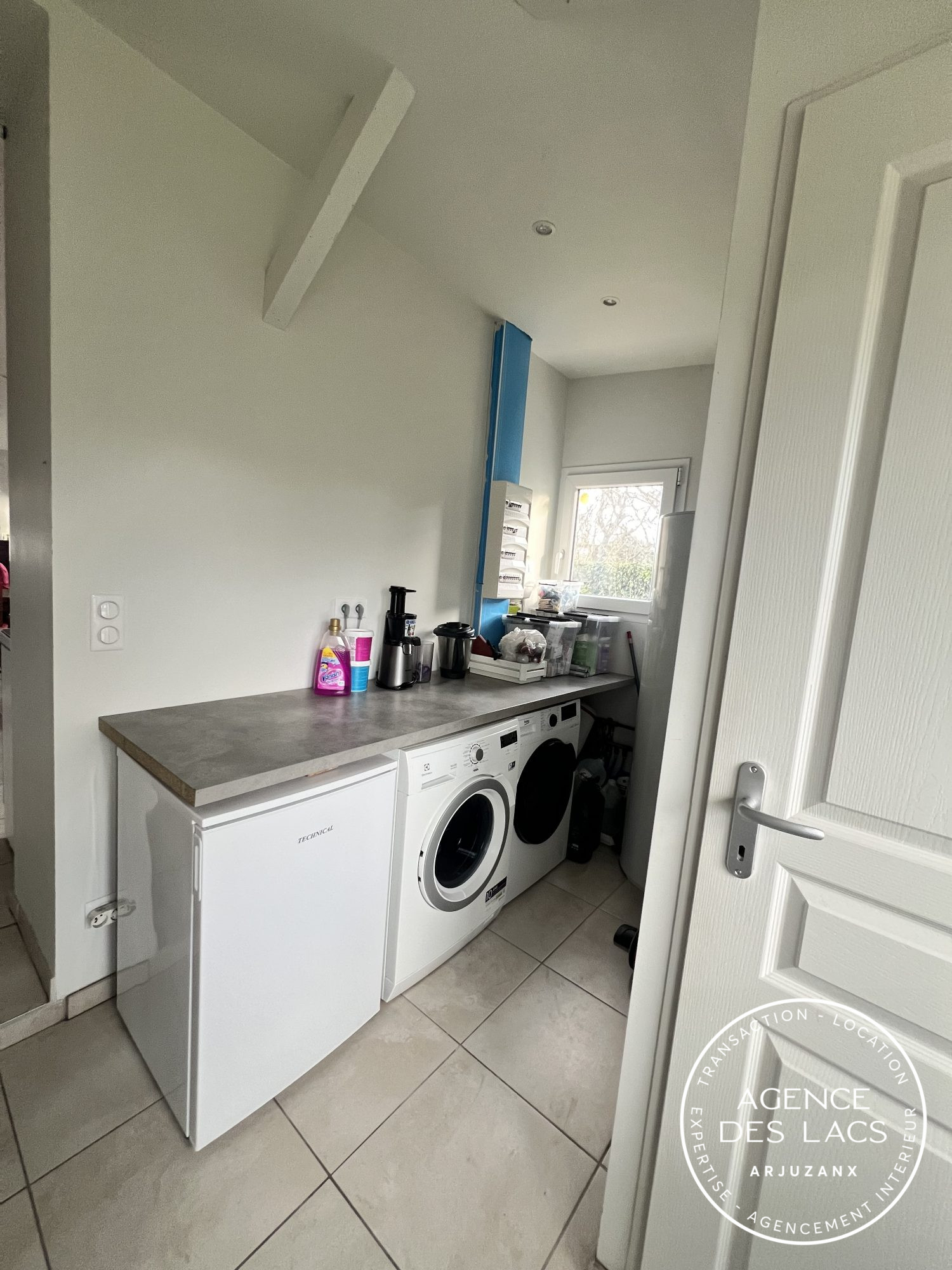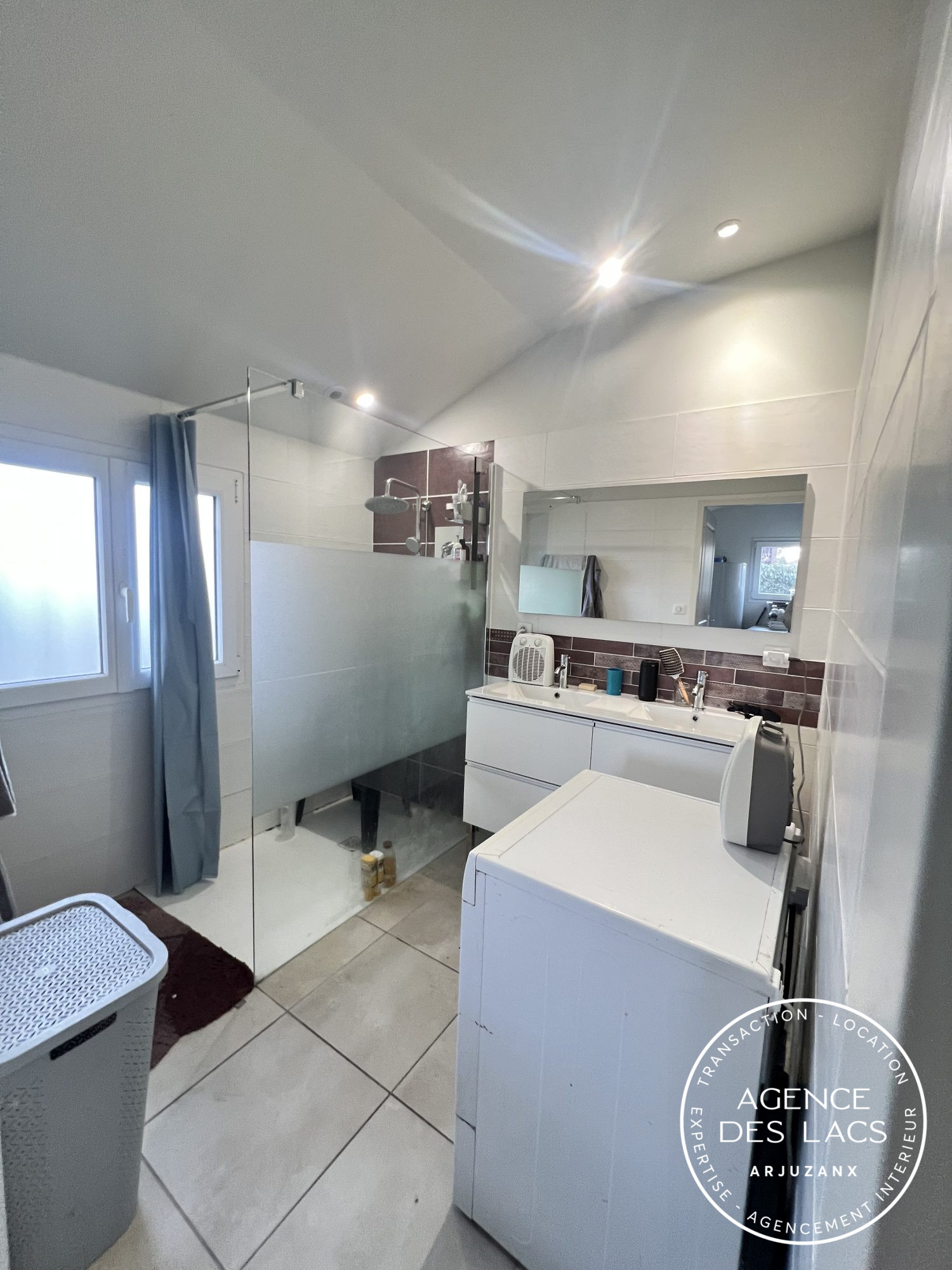 Au rez de chaussée : un séjour sur cuisine ouverte et terrasse couverte, une buanderie, une salle d'eau et un wc.