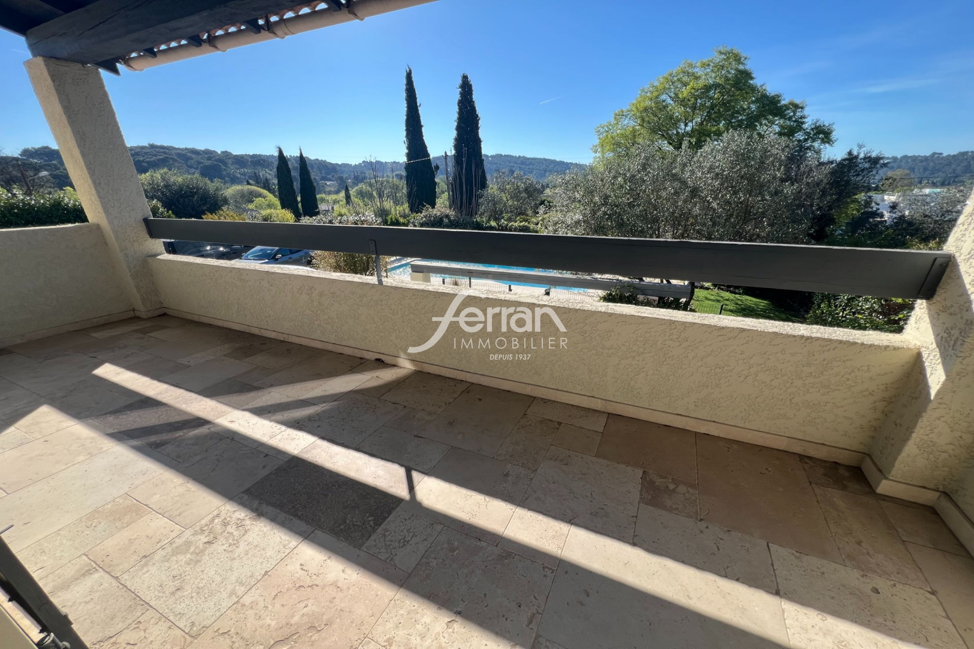 Terrasse exposée Sud-est avec une partie couverte.