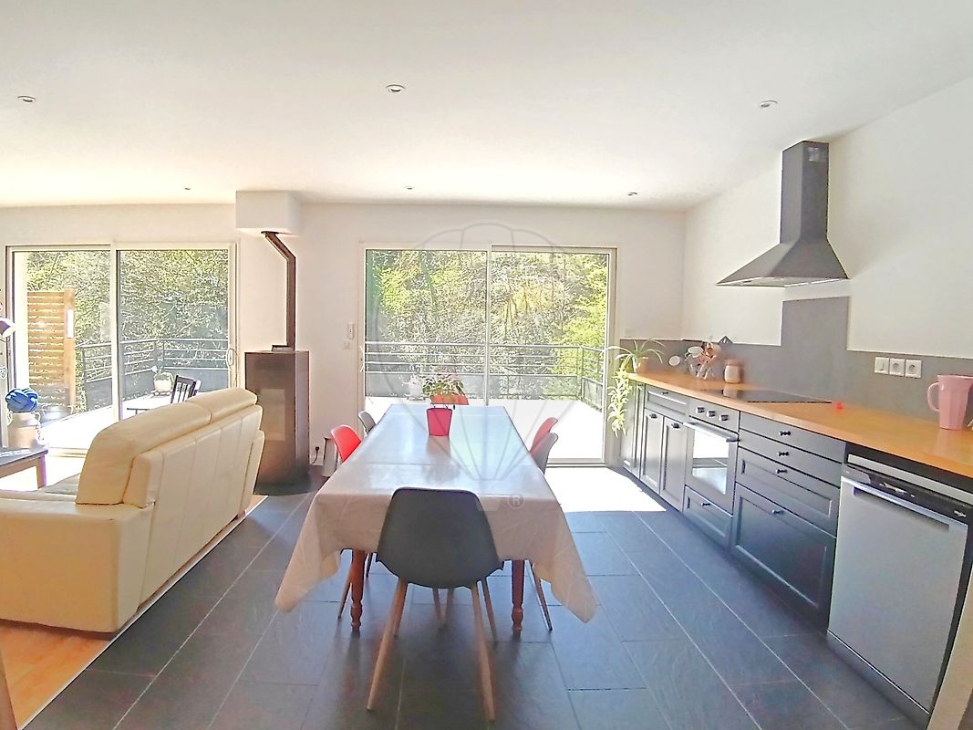 <p>Au rez-de-chaussée la maison se compose d'une pièce de vie lumineuse d'environ 40m² avec <strong>cuisine equipée</strong> donnant accès à une terrasse offrant <strong>une vue exceptionnelle sur la nature</strong>, d'une véritable buanderie, d'un WC et d'un <strong>garage indépendant.</strong>
