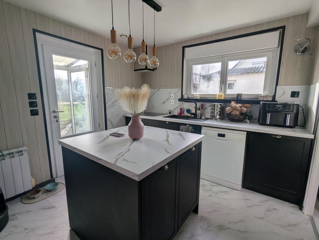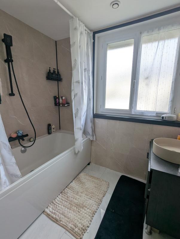 SAINT MANVIEU NORREY centre bourg, maison rénovée de 75m² comprenant cuisine aménagée et équipée, séjour, salle de bain, WC, à l'étage : une chambre avec dressing et un bureau ou petite chambre. Sous-sol aménagé et isolé offre une grande chambre supplémentaire de plus de 15m².
