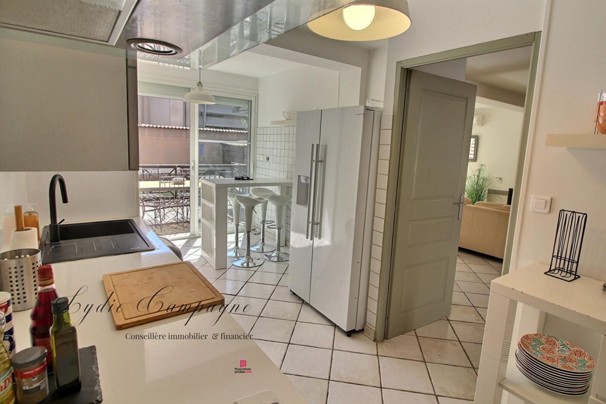 Cuisine indépendante entièrement aménagée et équipée, avec coin repas et accès direct à la terrasse .
