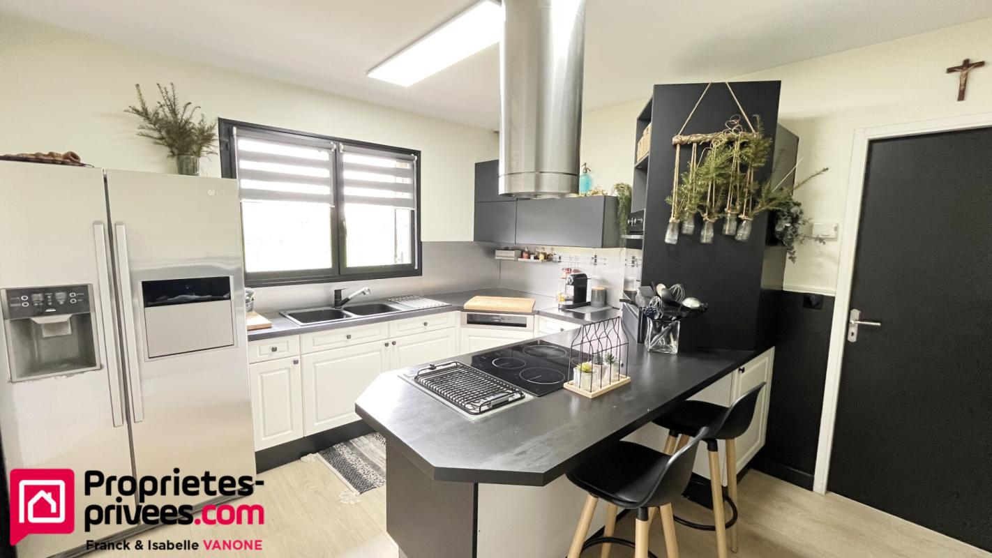 Dans le prolongement une grande cuisine entièrement meublée et équipée de 12m² avec une vue dégagée sur le jardin, complétée par un cellier/buanderie à proximité idéal pour les divers rangements. Un vrai plus pour une maison pratique et familiale.