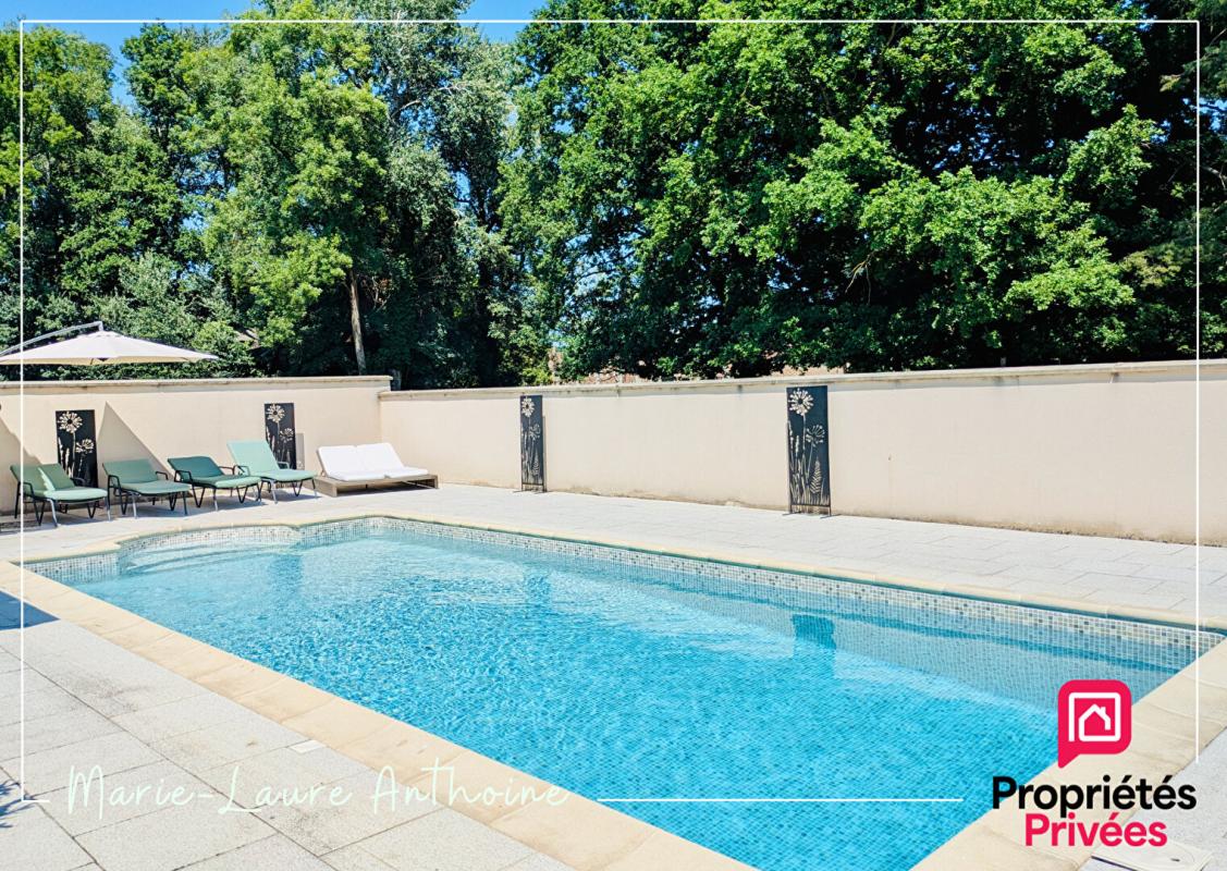 Profitez d'un espace détente sans vis-à-vis avec une piscine chauffée de 4x8 m, équipée d'un abri motorisé, ainsi qu'un pool house.