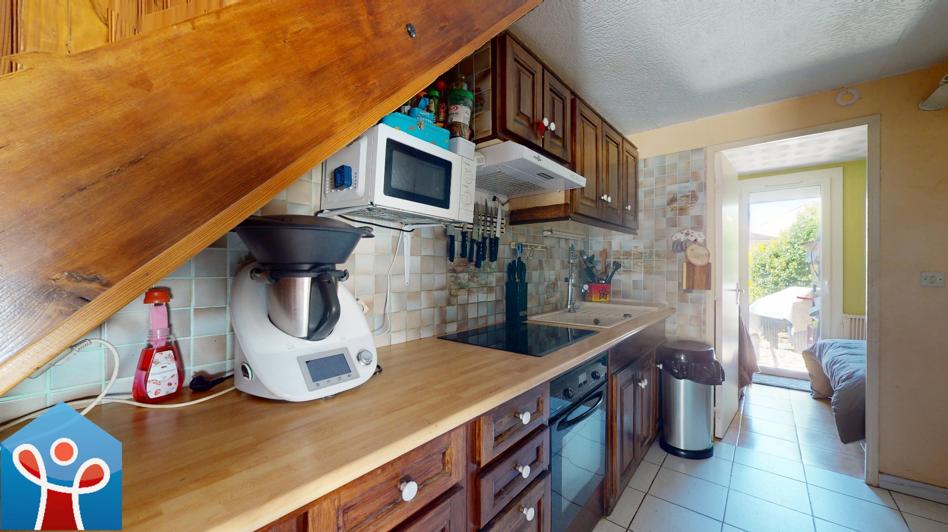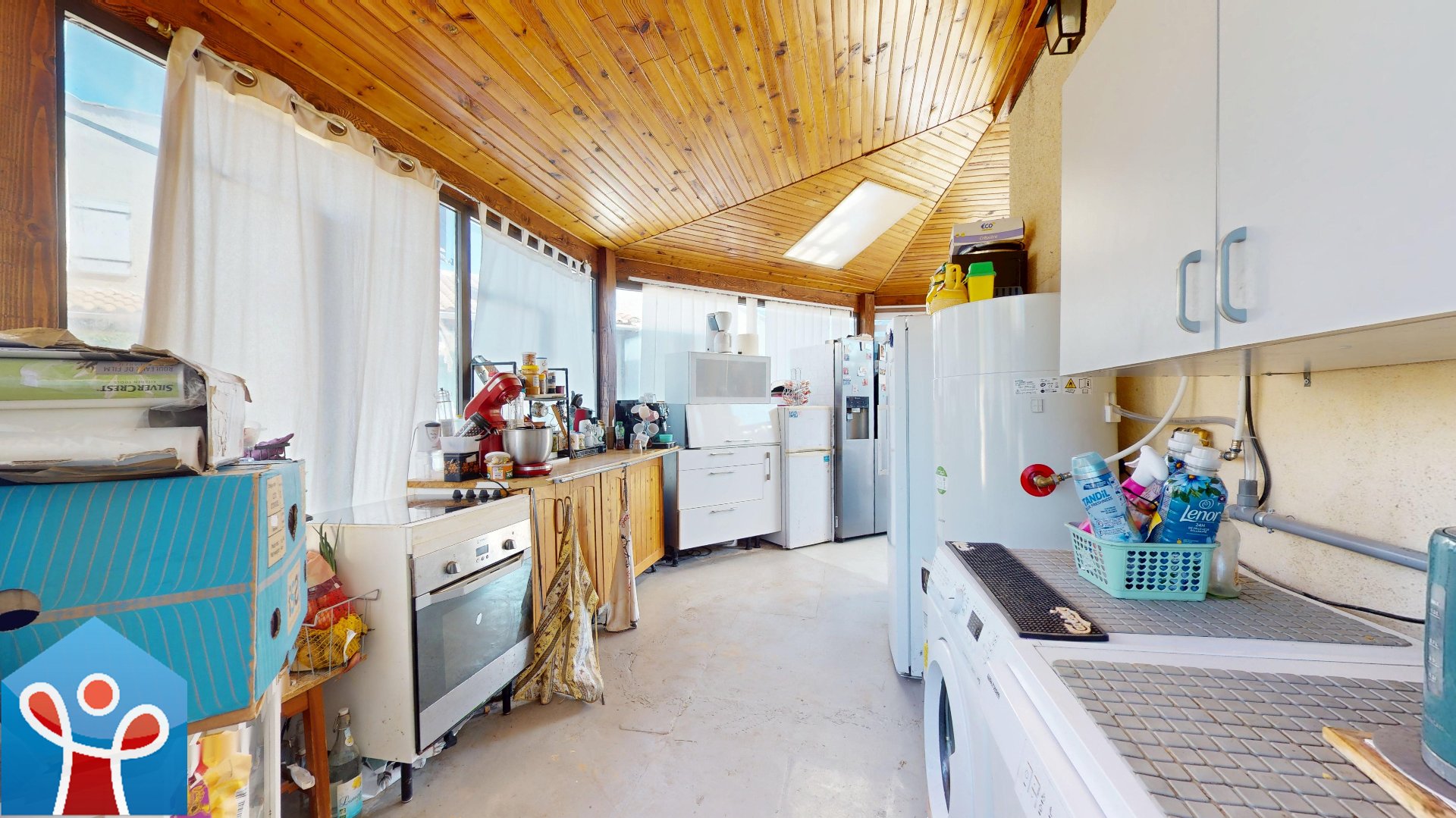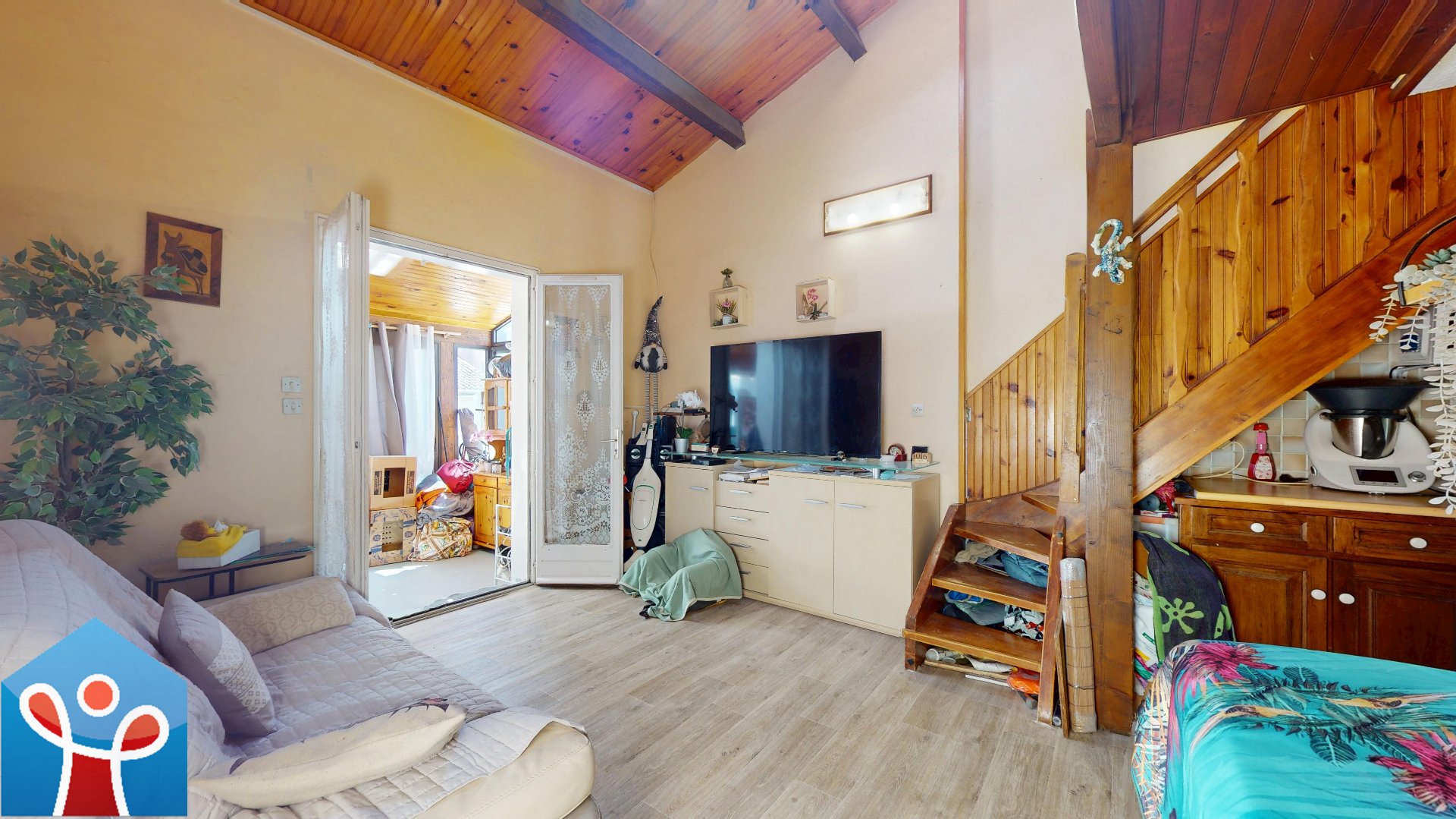 La maison développe environ 45 m² habitables complétée d'une belle véranda en angle de 25 m² prolongeant l'espace de vie. Le rez-de-chaussée se compose d'un séjour lumineux avec velux, d'une cuisine aménagée, d'une chambre, d'une salle d'eau ainsi que d'un WC indépendant.