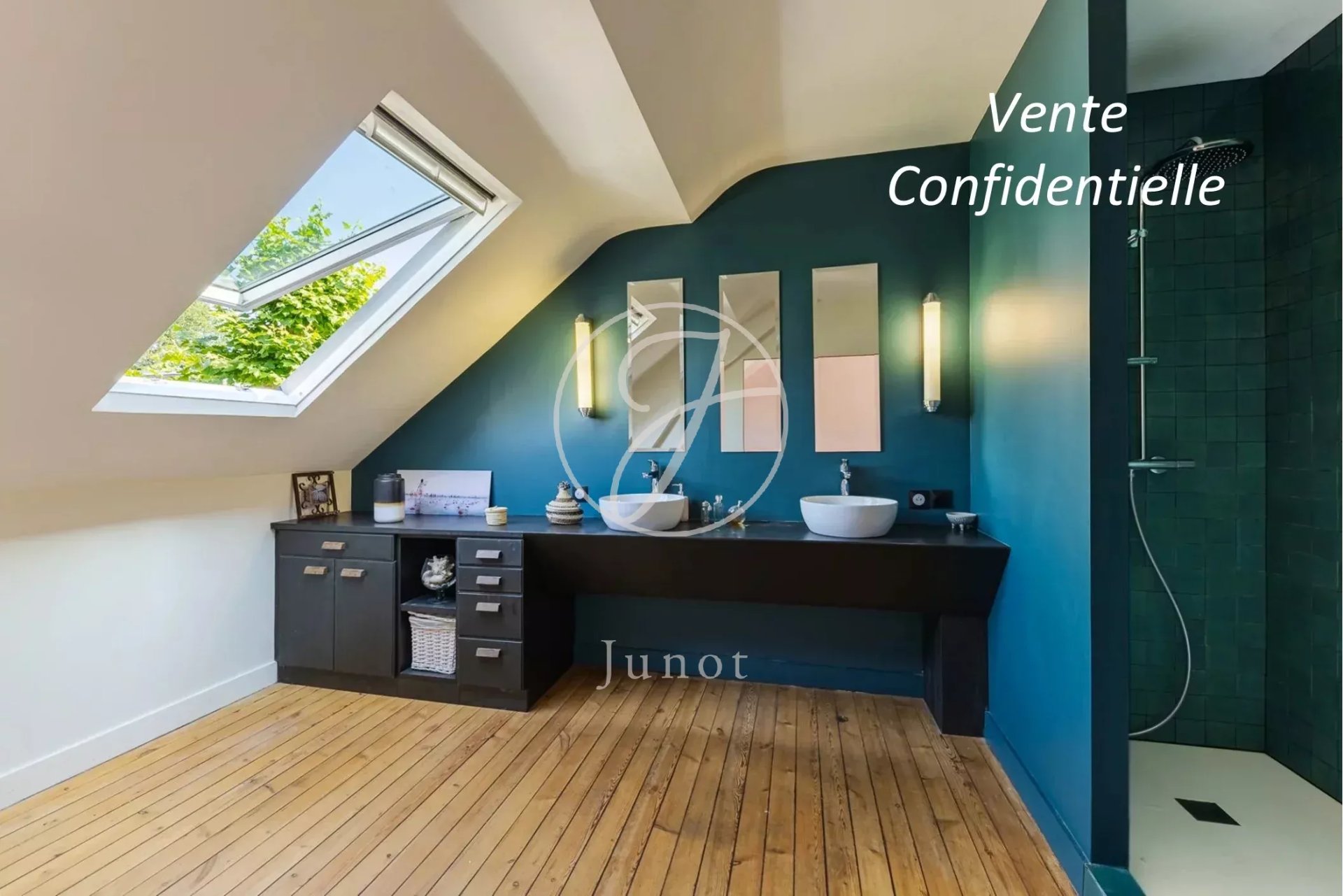Au rez-de-chaussée, l’entrée s’effectue par un grand vestibule sur deux niveaux avec quelques marches en granit, qui ouvre sur un dégagement avec un élégant escalier bois distribuant les différents niveaux de la maison. On accède à droite à une double réception traversante, lumineuse, au volume généreux, où cheminées anciennes et parquets d’époque confèrent une atmosphère chaleureuse et...