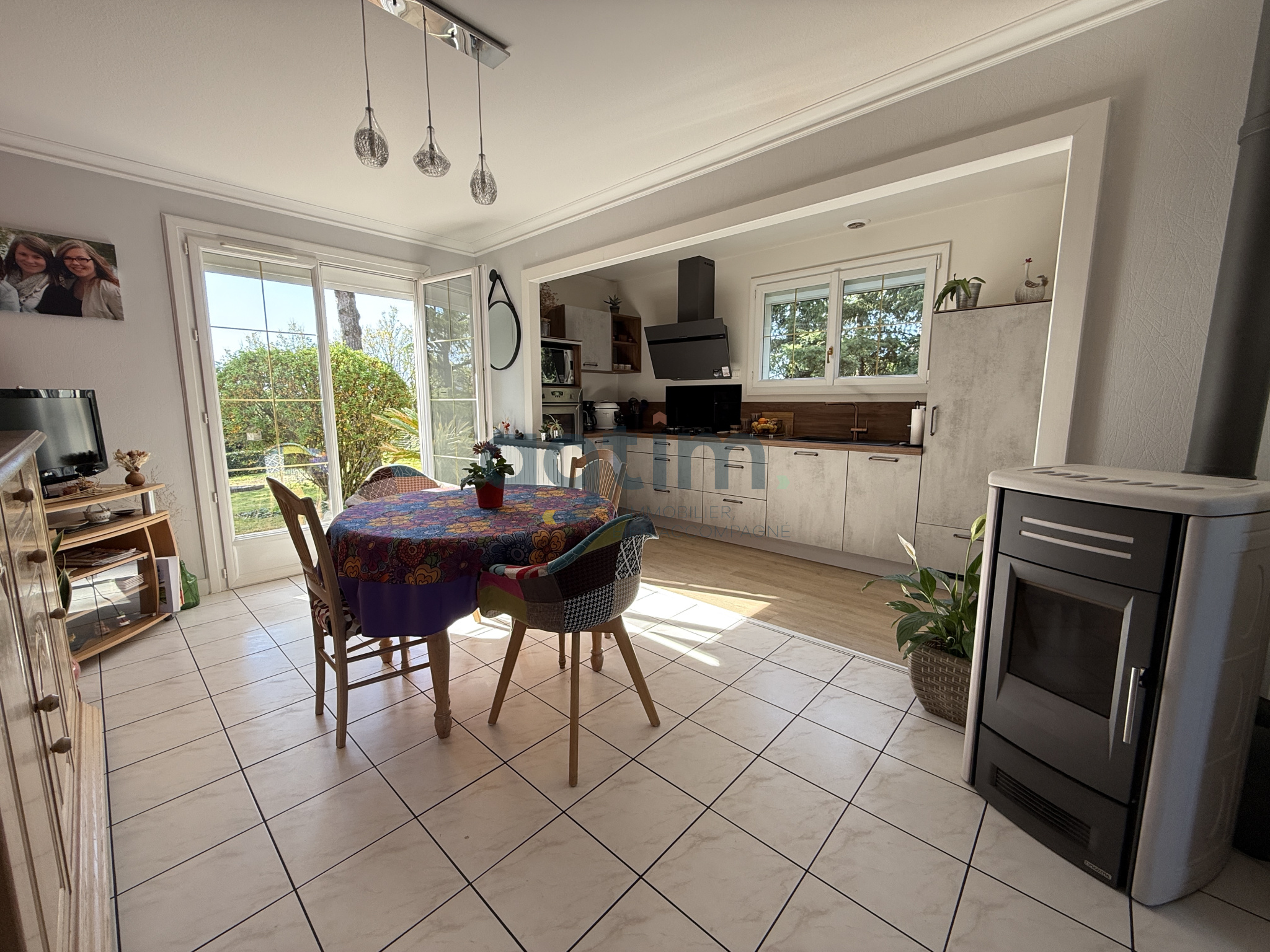 Au rez-de-chaussée, accès de plain pied au hall d'entrée distribuant la cuisine aménagée et équipée neuve avec son poêle à granulé récent, et son espace repas exposé plein Sud. Idéal pour manger à l'extérieur sur la terrasse, entourée d'arbres et de verdure; le salon/séjour bénéficie d'une double exposition et d'une vue magnifique sur le jardin;