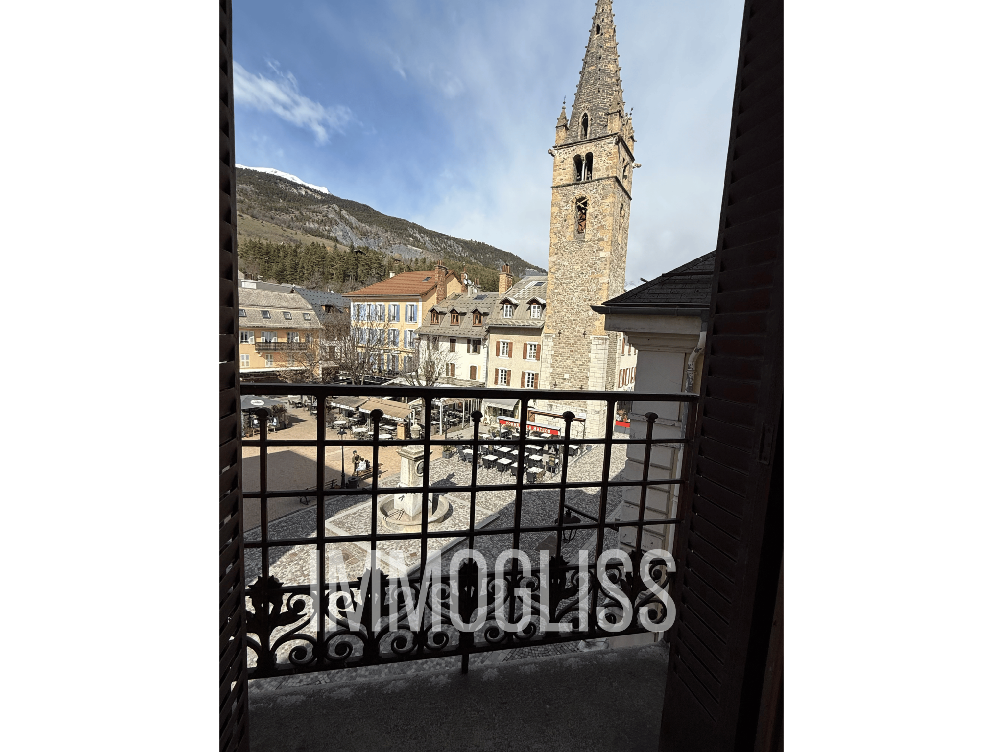 Il bénéficie d'une double exposition , d'un côté une vue dégagée sur les montagnes , de l'autre une agréable vue sur la place.