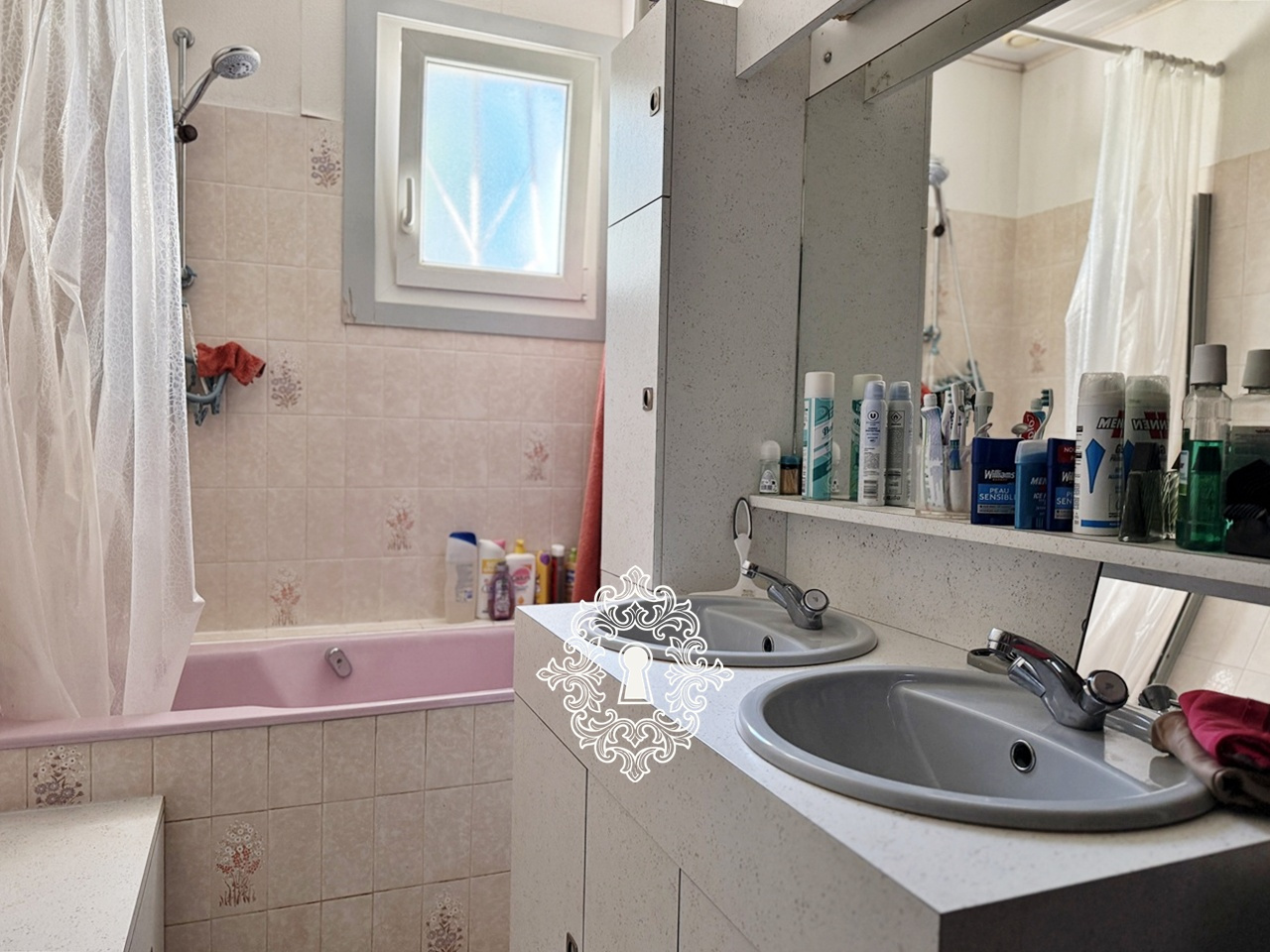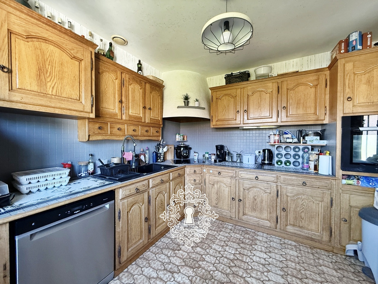 entrée, séjour 35 m2 (cheminée avec insert), cuisine aménagée et équipée, 2 chambres, salle de bains, 2 wc,