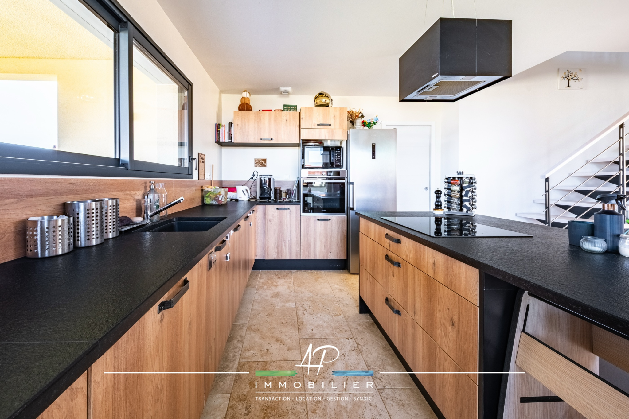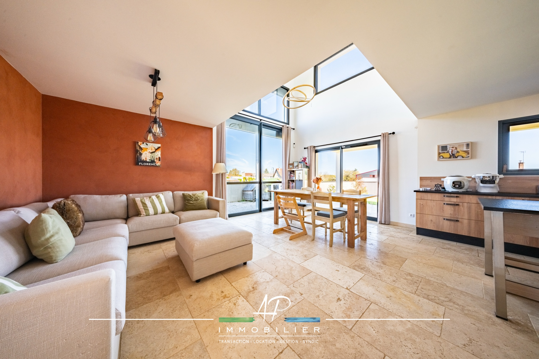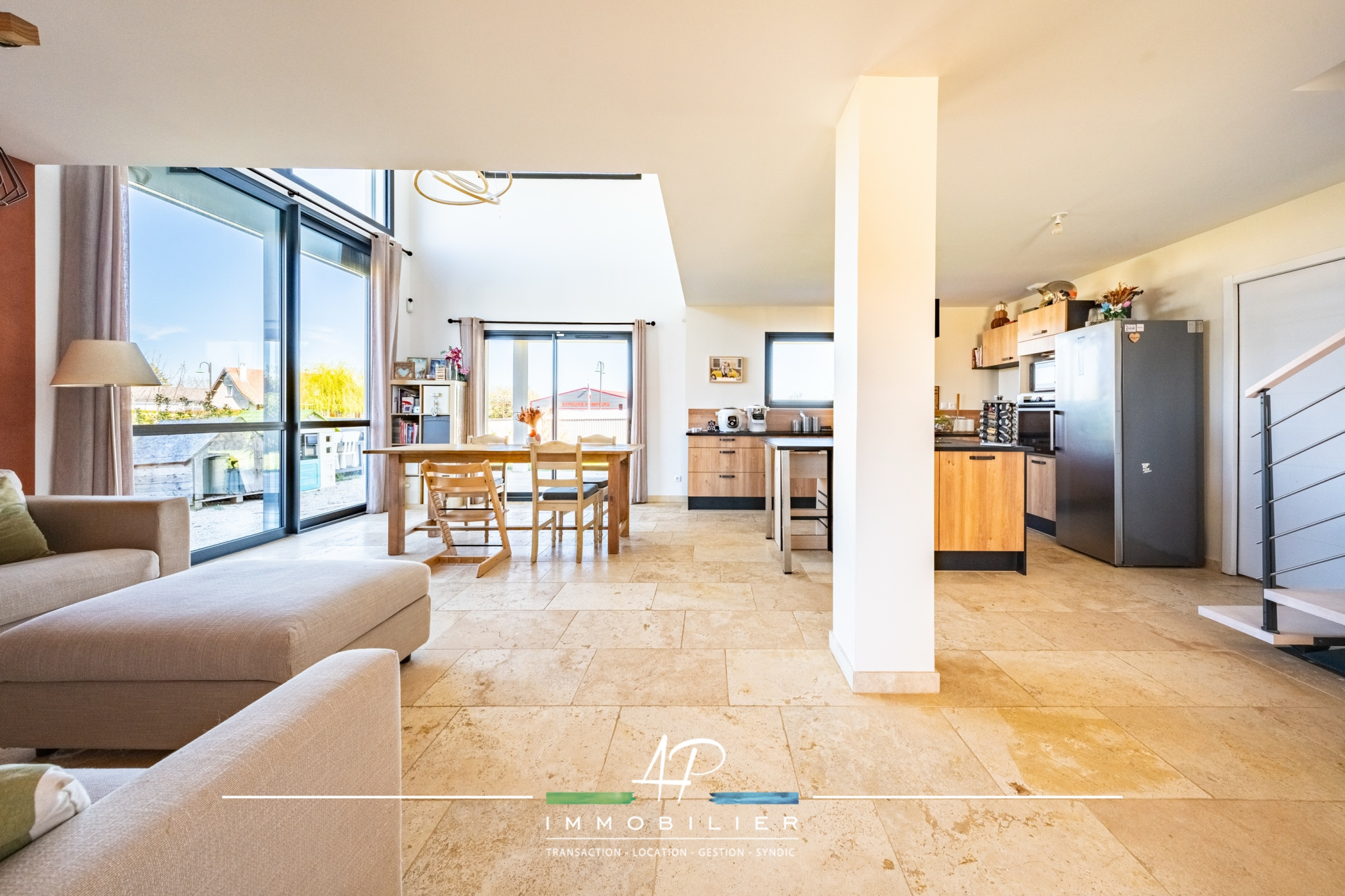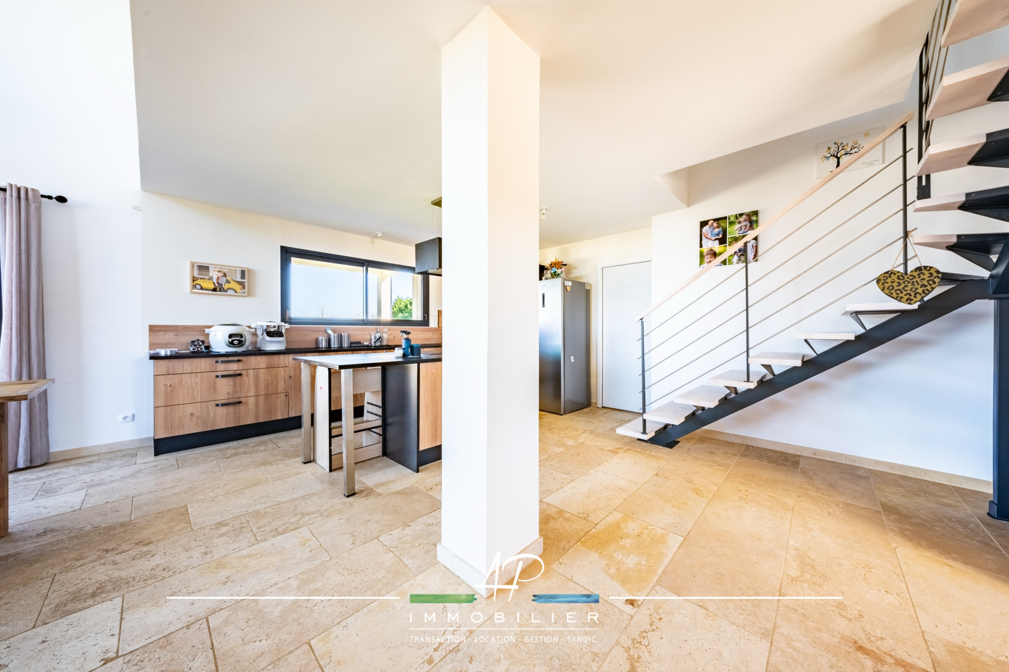 Dès l'entrée, vous découvrez une superbe pièce de vie d'environ 50 m2, baignée de lumière grâce à un mur vitré toute hauteur équipé de brise-soleil orientables (BSO). Le vide sur séjour apporte une réelle sensation d'espace et confère à l'ensemble un style résolument contemporain. La cuisine, entièrement aménagée et équipée, s'intègre parfaitement à cet espace convivial.