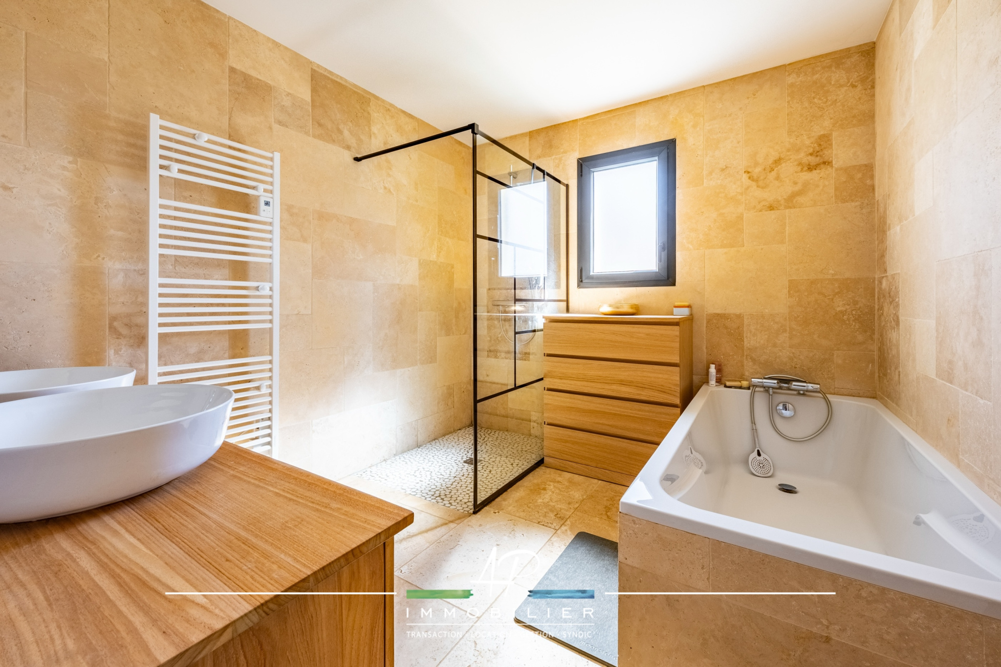 Les prestations sont particulièrement soignées : sols en travertin, parquets massifs, fenêtres et baies en aluminium avec volets roulants électriques, matériaux de qualité... une maison pensée dans les moindres détails.