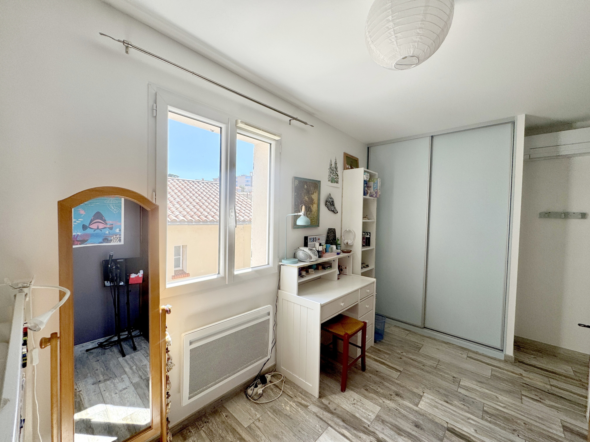 TOULON/La Serinette - 90 m2 villa on a 288 m2 plot - Entrance into living room with laundry room and fitted open-plan kitchen, bordering a charming small garden with an annex used as a reading room - WC with washbasin - Upstairs: 3 bedrooms with built-in wardrobes - Shower room / Walk-in shower / WC - RT 2012 compliant / Semi-detached - Pellet stove and air conditioning