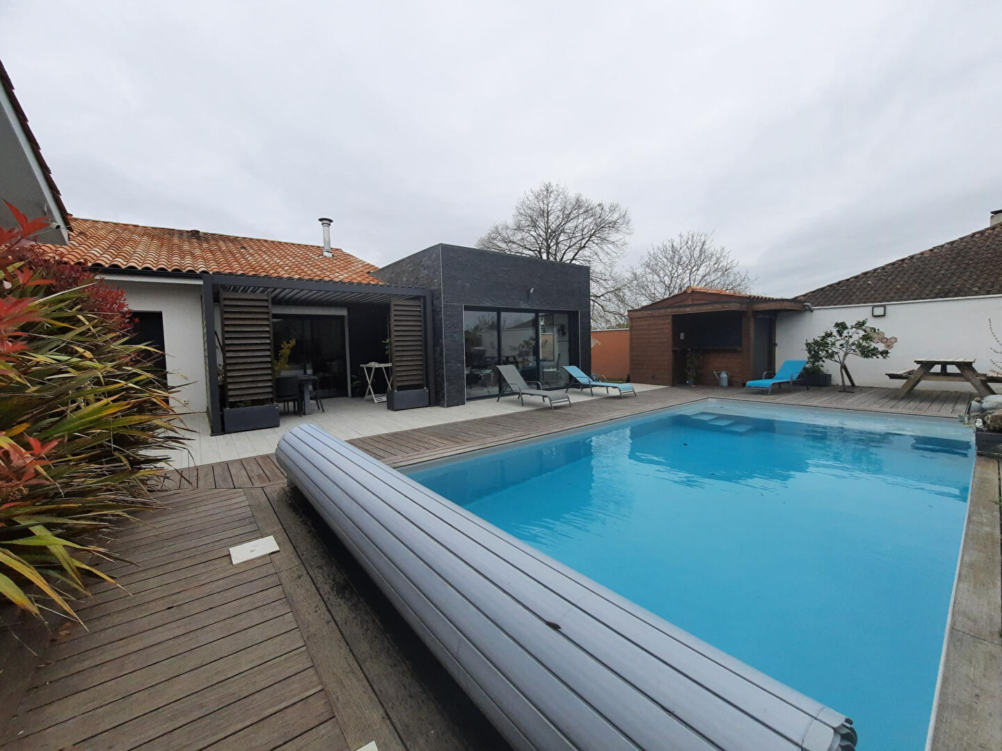Un extérieur propice à la détente avec une terrasse et sa pergola donnant sur la piscine chauffée et sécurisée;