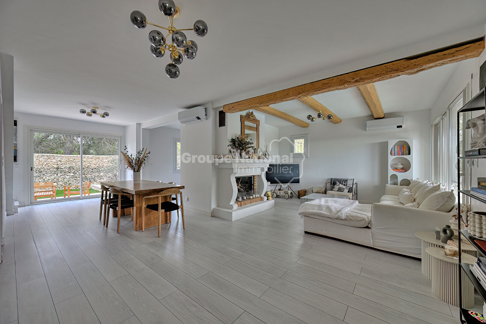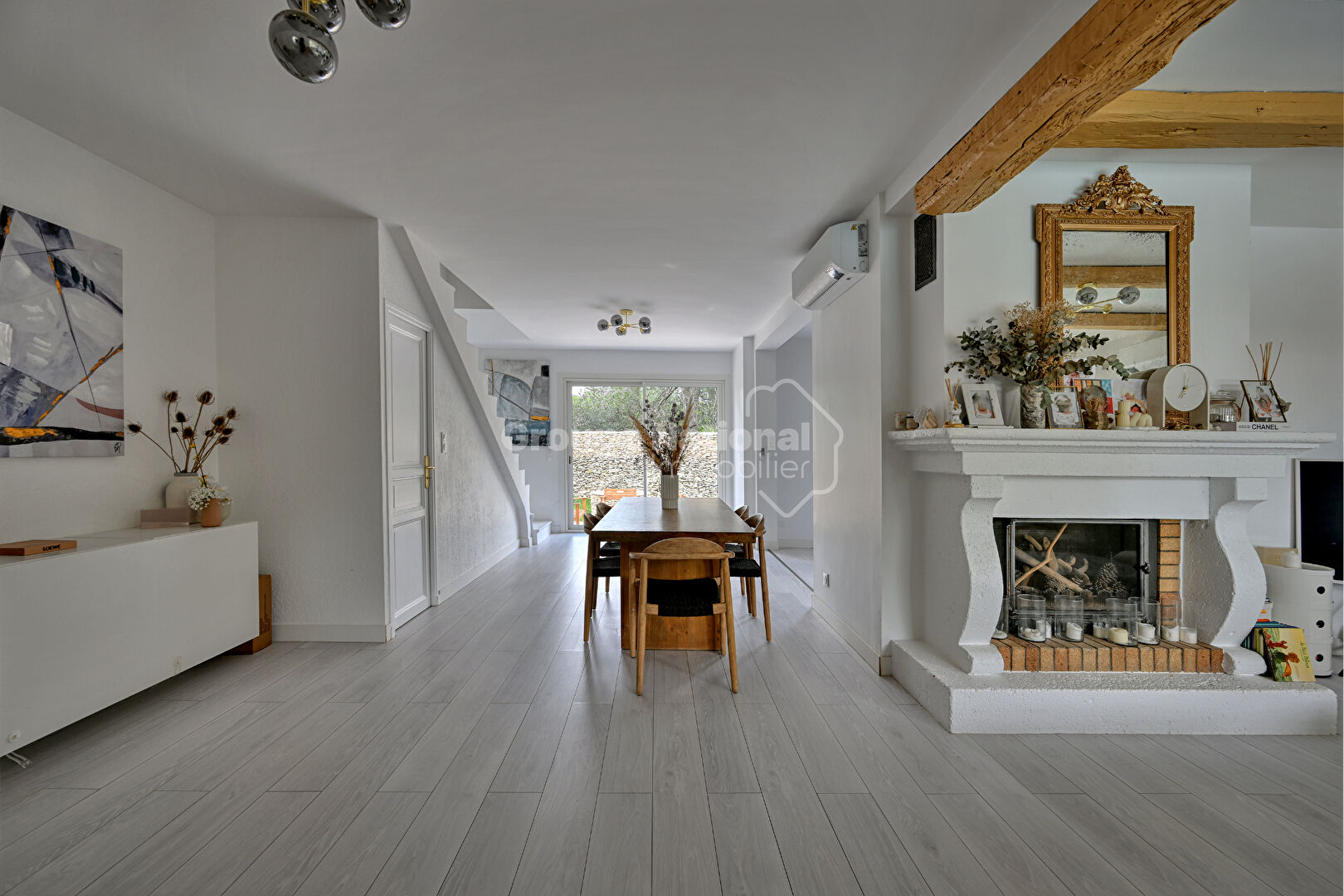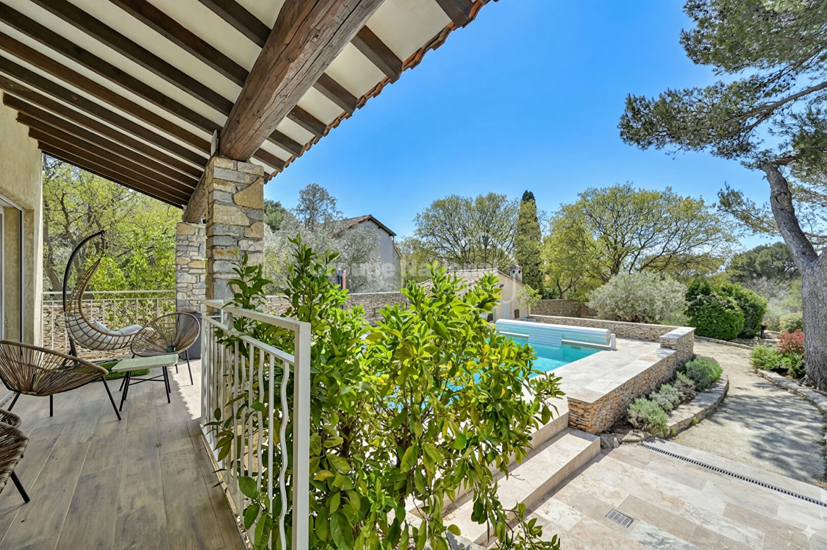 L'entrée ouvre sur une pièce de vie de 60 m² comprenant un salon agrémenté d'une cheminée, une salle à manger et une cuisine équipée. Cet espace donne accès à deux extérieurs, avec une terrasse à l'arrière et une terrasse principale orientée vers la piscine. Ce niveau de plain-pied comprend également une suite parentale avec dressing et une salle de bains équipée d'une douche et d'une baignoire. À l'étage, l'espace nuit distribue deux chambres ainsi qu'une salle d'eau.