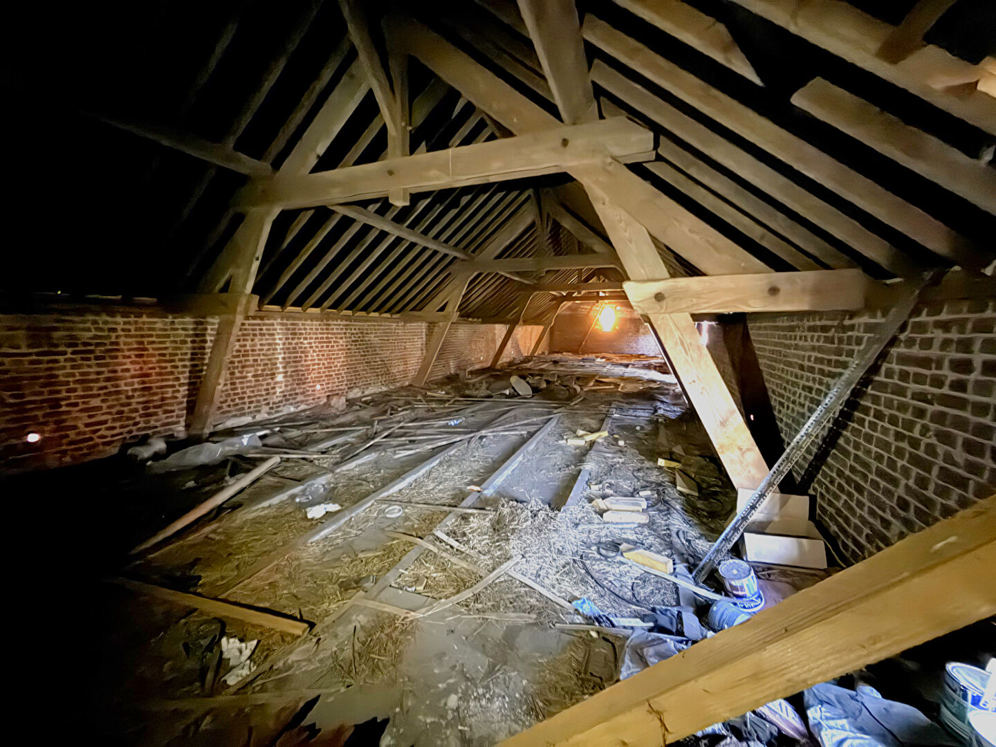 Grange en très bon état, pleine de charme, offrant de beaux éléments anciens tels que la brique, les poutres apparentes, un oeil-de-boeuf et une hauteur sous plafond de 2,95 m.² Elle bénéficie également de prestations récentes : toiture refaite intégralement en 2021, gouttières et caches moineaux neufs, ainsi que les joints des briques du pignon refaits.