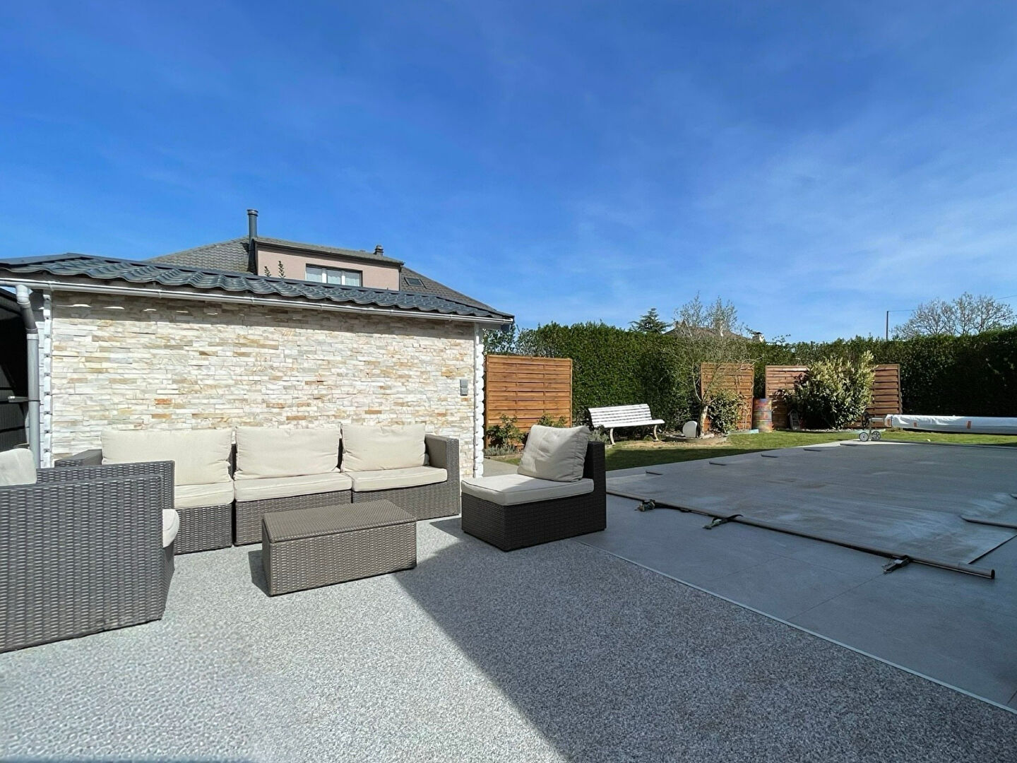 A l'extérieur, vous profiterez d'une agréable terrasse (dont une partie couverte, idéale pour en profiter par tous temps) et du beau jardin entièrement clos et arboré avec son cabanon et sa piscine (7*3.5)