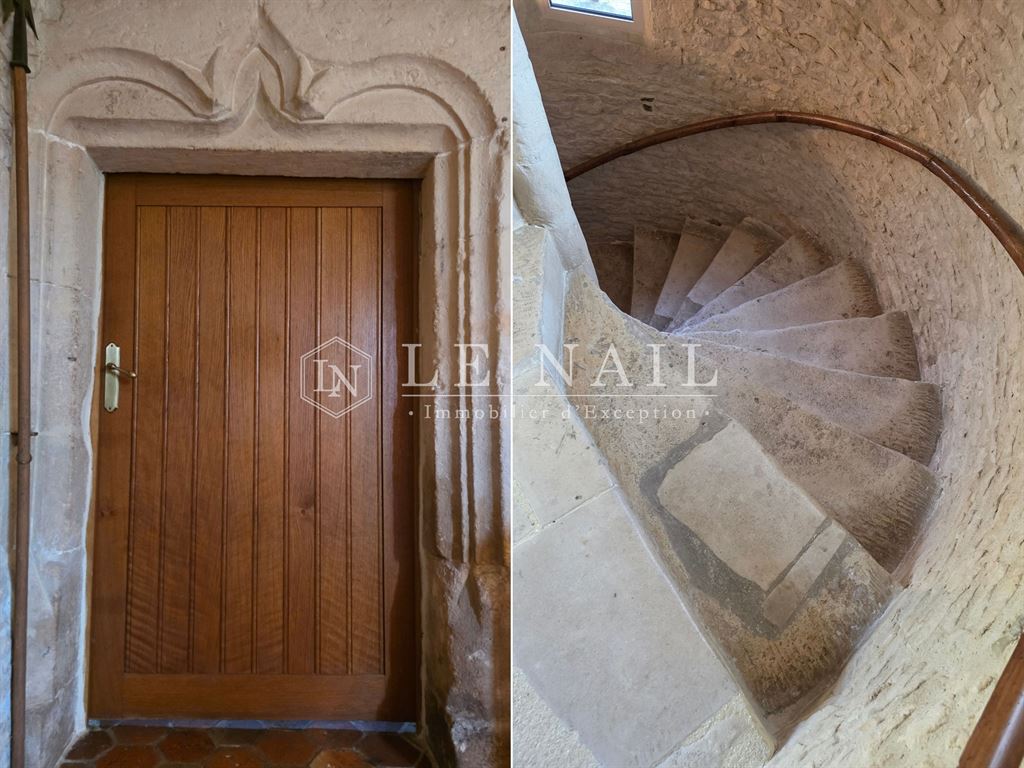 Une large porte basse à gauche rappelle l’accès d’origine à la cave pour les tonneaux, tandis qu’à l’arrière, une tour hors-œuvre abrite un élégant escalier à vis en pierre.