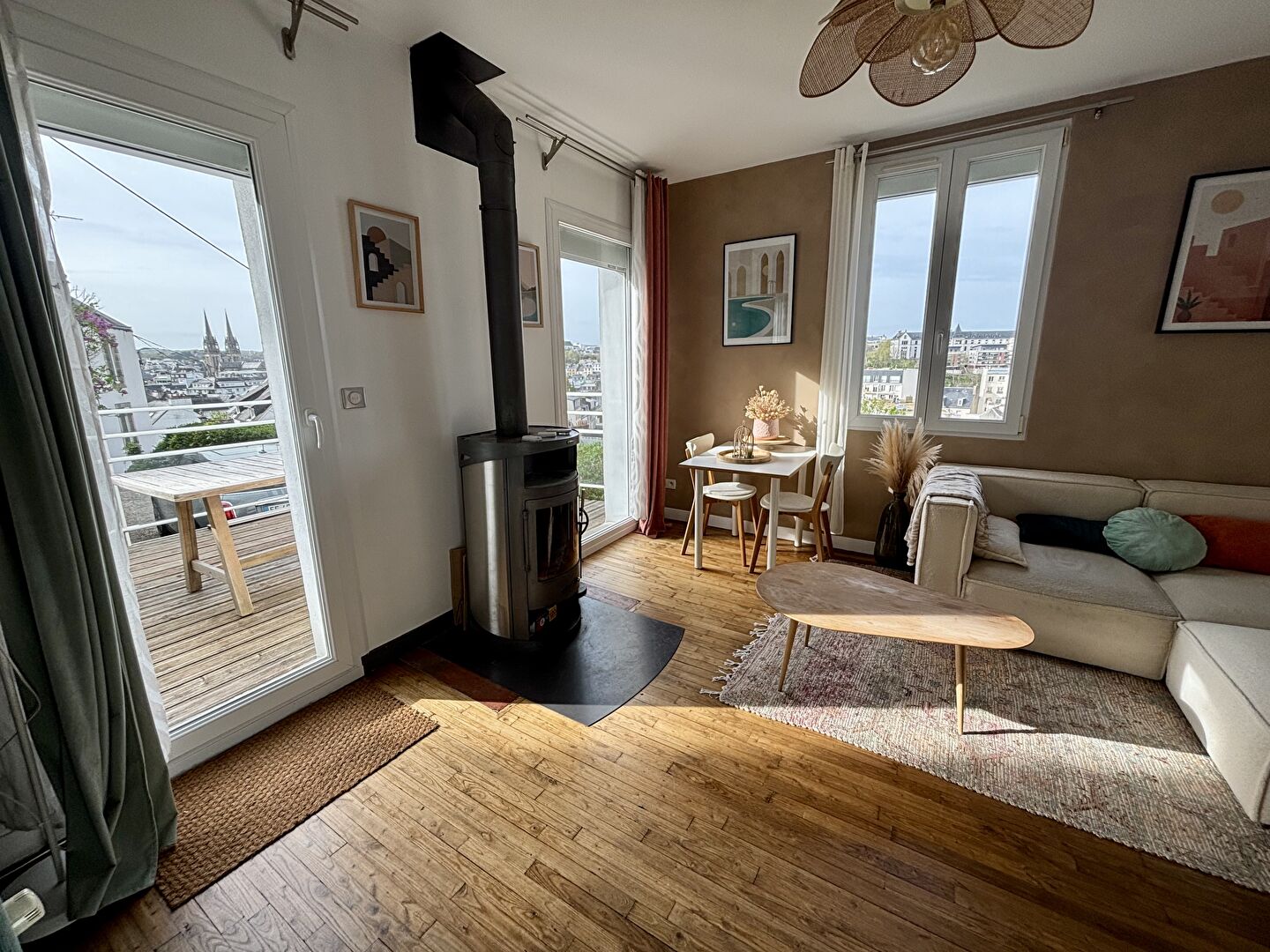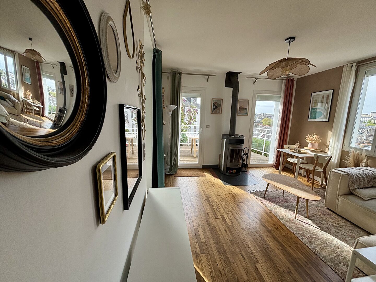 Nouveauté, Quimper centre ville immédiat pour cette jolie maisonnette rénovée avec gout, offrant une entrée, cuisine équipée, séjour avec poêle à bois, 2 chambres, sdb, wc. Sous sol. Jardinet avec terrasse bois. Stationnements sur la parcelle. Magnifique vue dégagée sur la ville et la cathédrale.