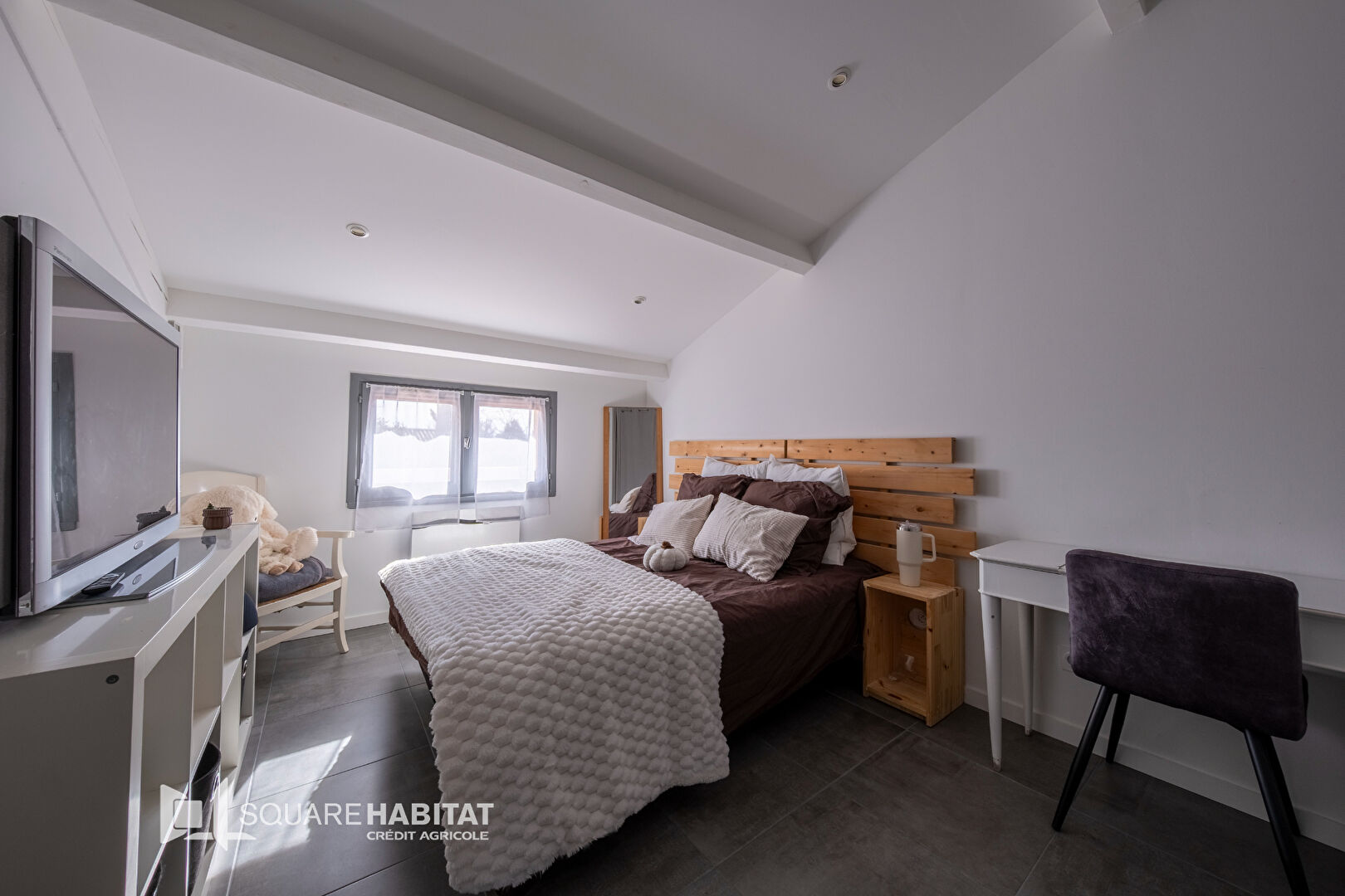 Elle se compose d'une entrée, avec cuisine équipée indépendante. Grand séjour cathédrale lumineux avec cheminée.