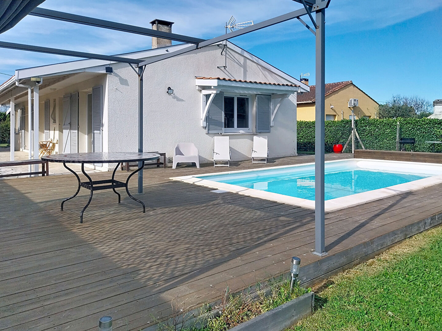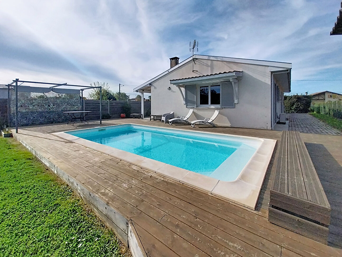 Le tout sur un jardin avec une piscine chauffée, une terrasse en bois, une cuisine d'été, un cabanon et un garage de 26m².