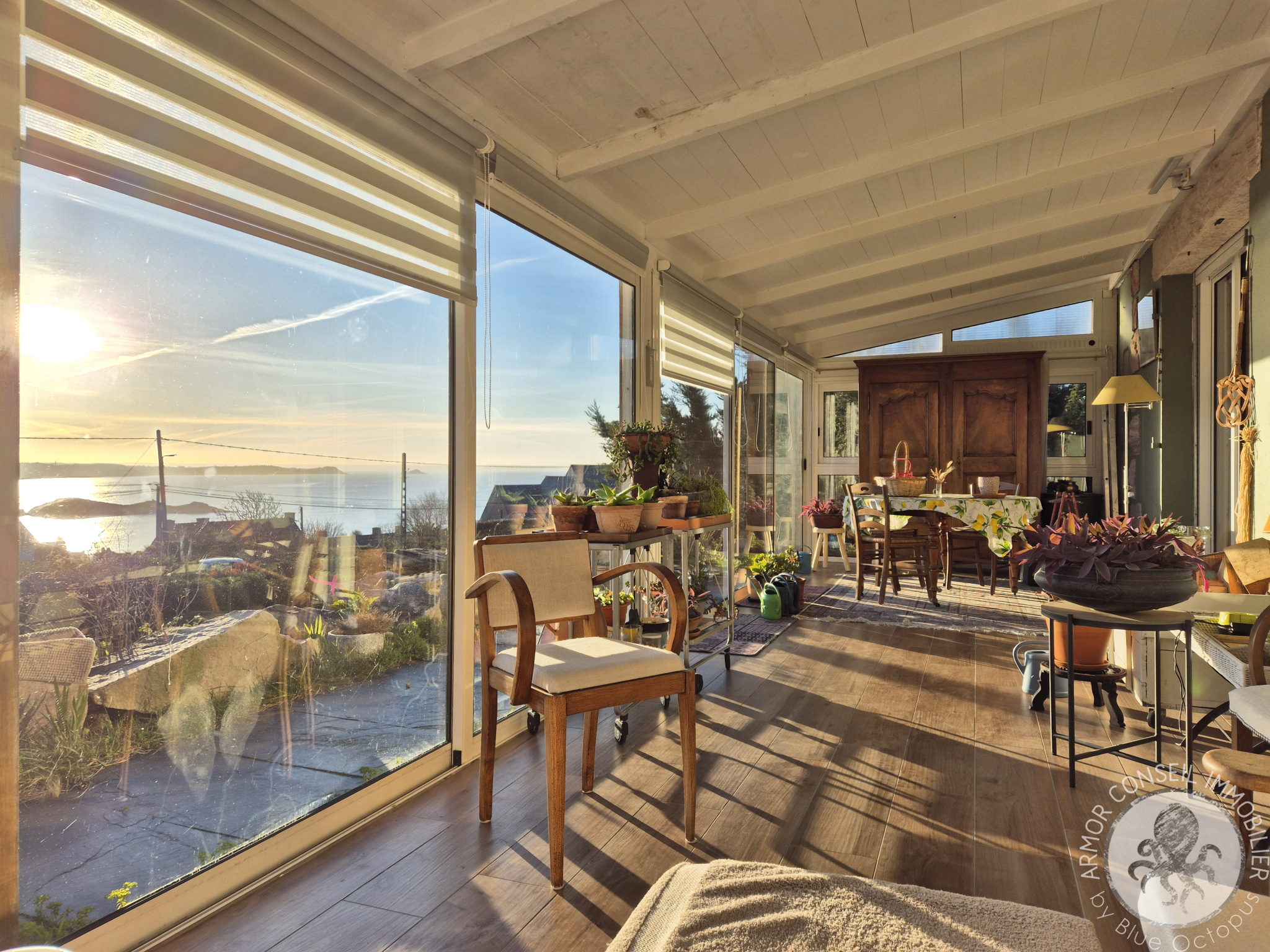 Orientée plein sud, la propriété bénéficie d'un ensoleillement optimal tout au long de la journée et offre de magnifiques couchers de soleil sur la mer.
