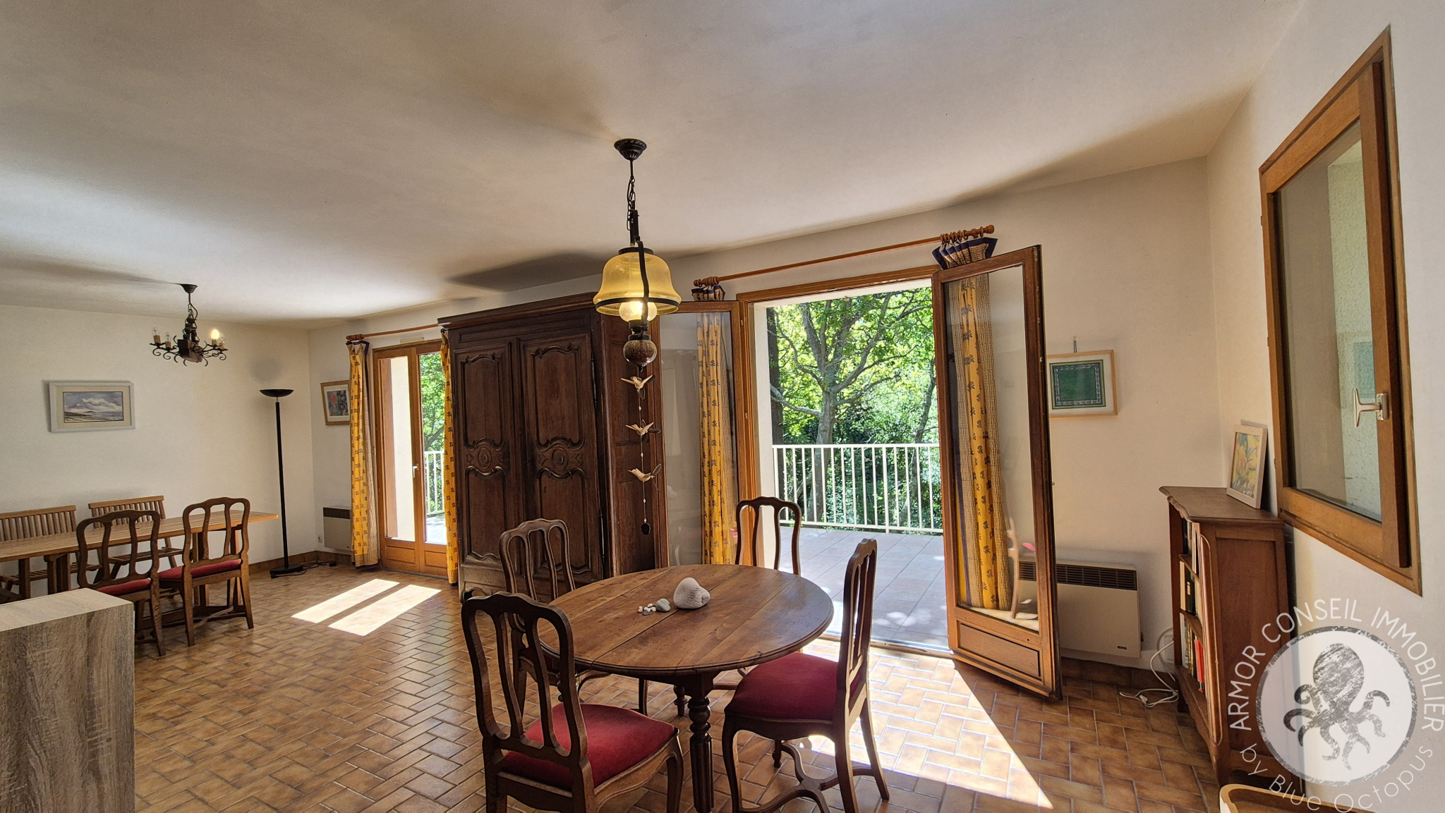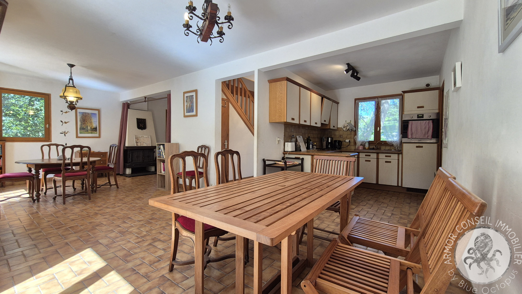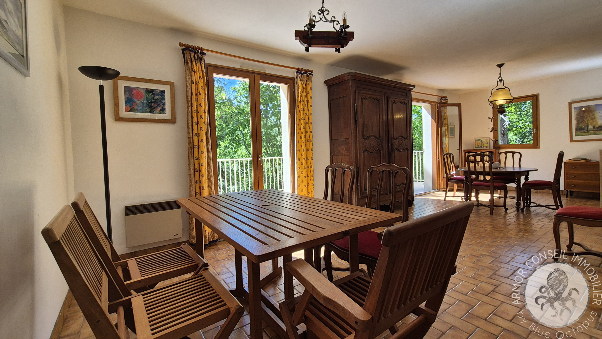 La pièce de vie offre plusieurs accès à une grande terrasse exposée sud-ouest, avec une belle vue sur la nature.