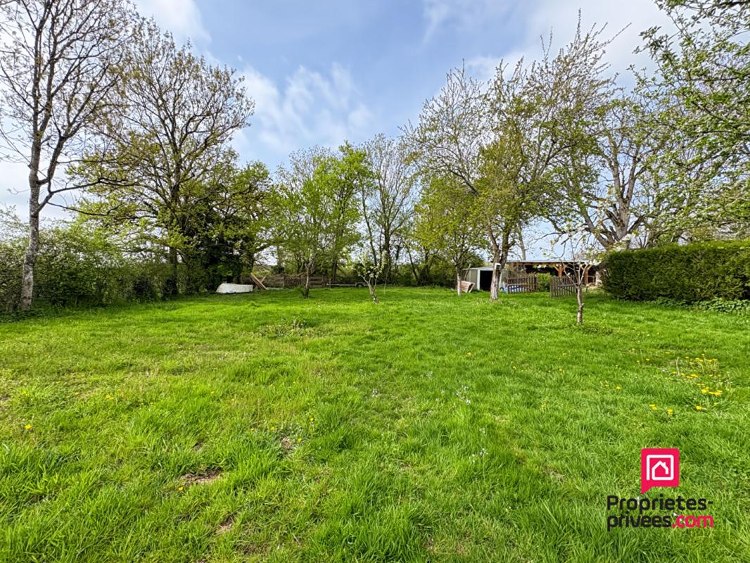 Terrain clos et arboré avec cabanon de jardin et structure à usage de garage.